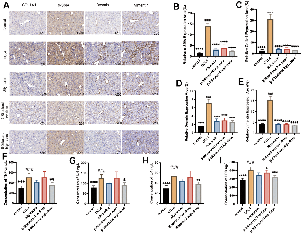 To assess the expression of four markers of liver fibrosis (COL1A1, α-SMA, Desmin, and Vimentin) and to investigate the possibility of β-sitosterol in reducing liver fibrosis, IHC staining was performed. Fibrosis markers were notably decreased in the SIL and β-sitosterol groups compared to the CCl4 group (Figure 4A–4E). Furthermore, in mice, β-sitosterol significantly reduced the serum levels of inflammatory markers (LPS, TNF-α, IL-1, and IL-6) compared to CCl4 (Figure 4F–4I). Results from LX-2 cells demonstrated that β-sitosterol decreased the protein expression of COL1A1 when compared to the control, indicating its capacity to ameliorate liver fibrosis in both in vivo and in vitro conditions (Figure 5A).