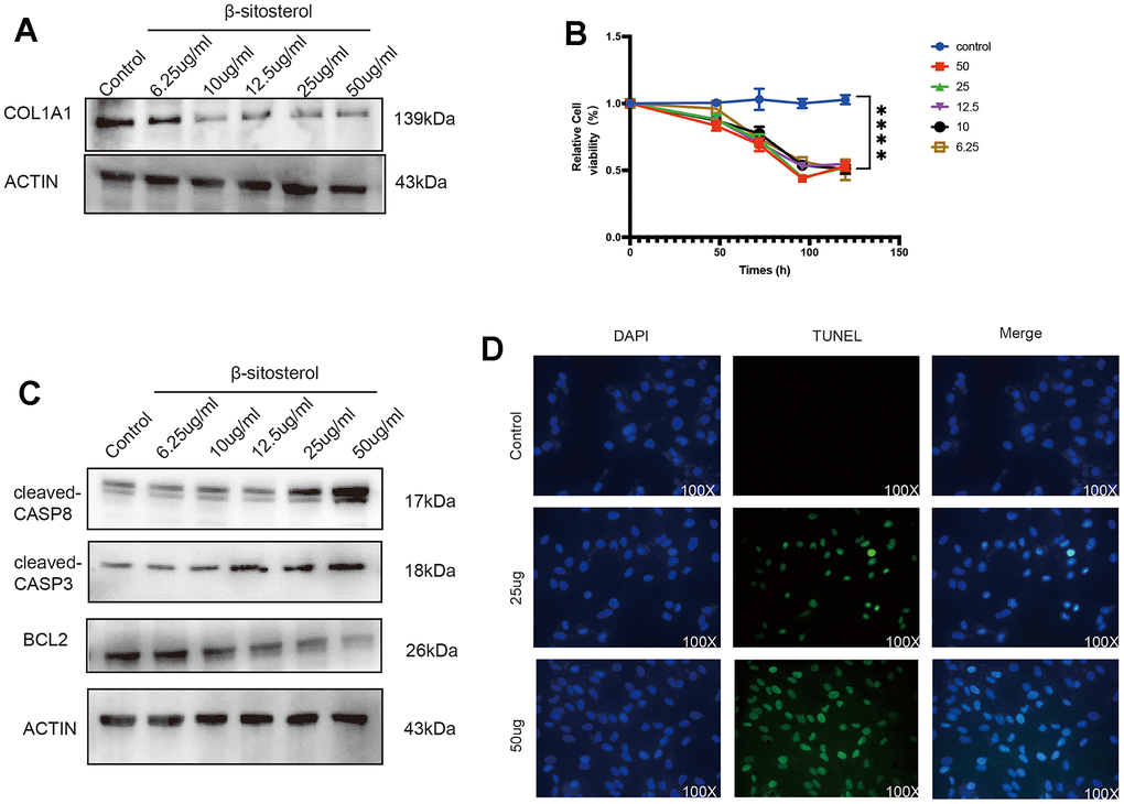 To examine the effect of β-sitosterol on LX-2 cell activity, a CCK-8 assay was performed, which showed a time-dependent effect (Figure 5B). β-sitosterol was found to induce apoptosis in LX-2 cells, as confirmed by TUNEL staining (Figure 5D). Western blot analysis further confirmed the effects of β-sitosterol treatment, showing a decrease in CASP3 precursor and BCL2 expression, as well as an increase in c-CASP3 and c-CASP8, and a decrease in CASP8 compared to the control (Figure 5C). The findings suggest that β-sitosterol has the potential to cause apoptosis in HSCs.