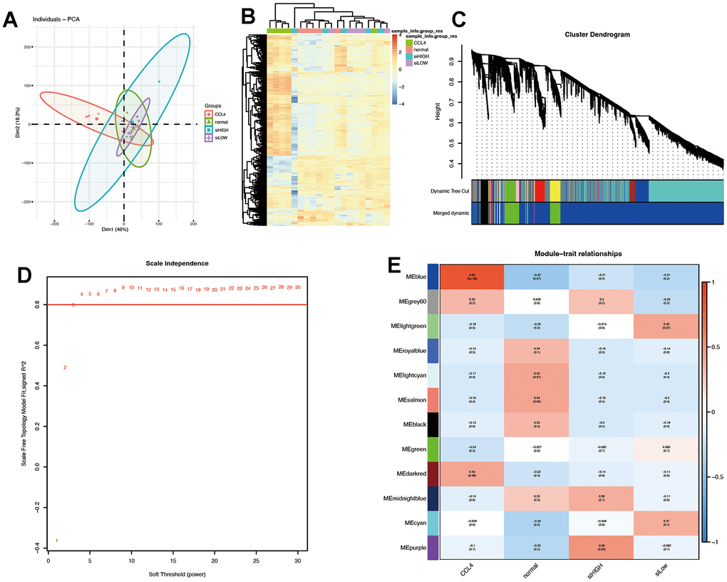 PCA was employed to reduce the dimension of the pre-processed matrix, and it was observed that the CCl4 model was distinct from the other three datasets (Figure 6A). The heat map analysis further supported these findings (Figure 6B). The WGCNA package was used to identify twelve gene co-expression modules from a dataset consisting of 19,971 genes across 20 samples, as shown in Figure 6C, 6D. The soft threshold was set to three (Figure 6C).