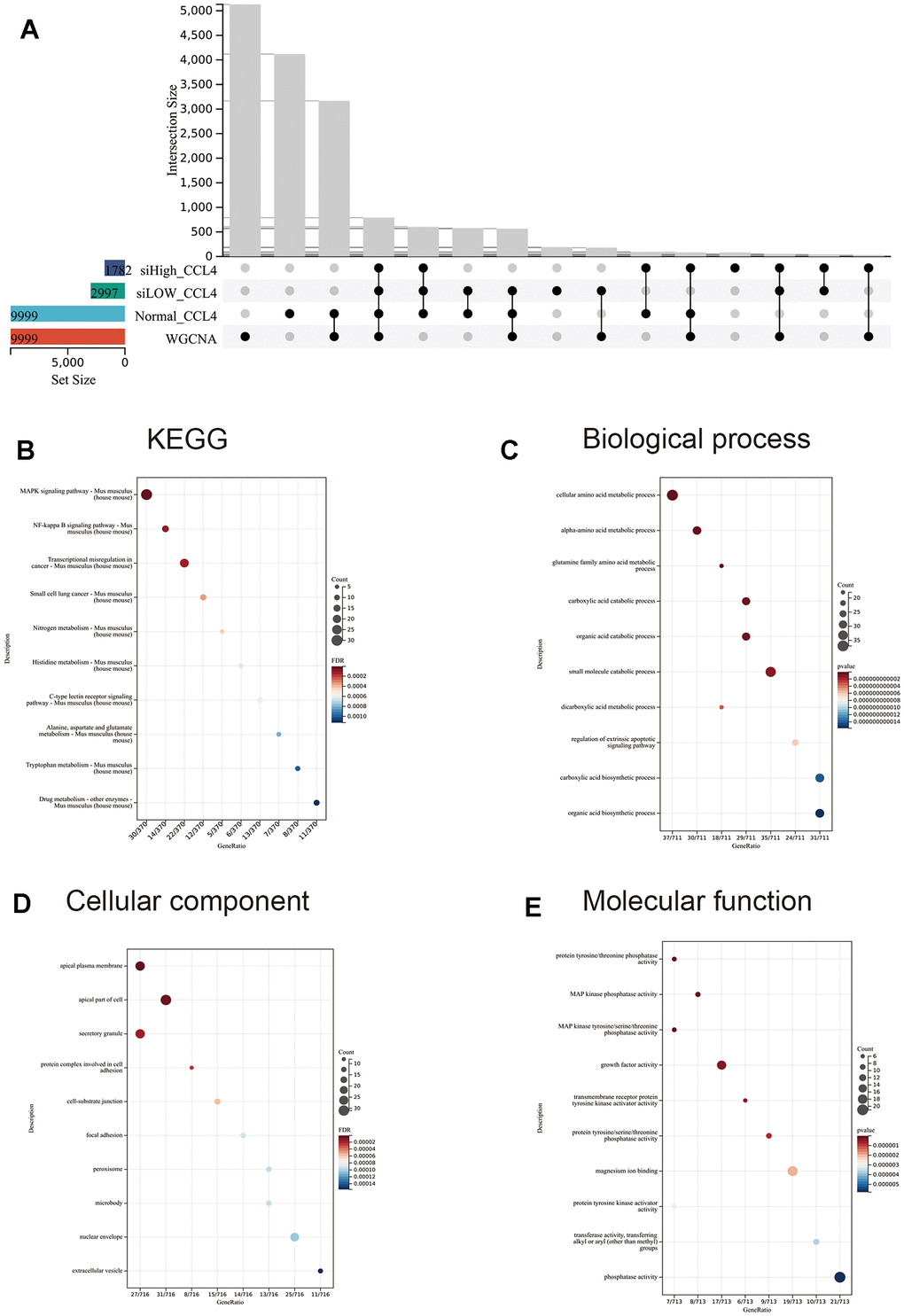 The blue module, which showed the strongest correlation with the CCl4 group and negative correlation with the normal, β-sitosterol low and high dose groups was identified as the most significant module (Figure 6E). Based on the differential genes between each group and the control group, this module was crossed with the differentially expressed genes and the resulting genes were analysed using GO and KEGG pathway analysis (Figure 7A).