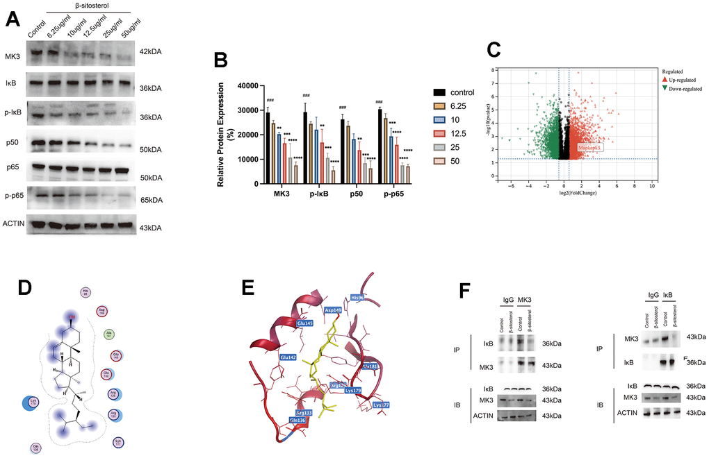 To gain insights into the mechanism by which β-sitosterol can ameliorate liver fibrosis through the modulation of MK3, we referred to our KEGG analysis, which revealed differential gene enrichment in the NF-κB pathway. Our results demonstrated that β-sitosterol reduced the levels of p50, p65, and pp-65 and the phosphorylation of IκB. These findings suggest that β-sitosterol can attenuate NF-κB pathway activation by inhibiting MK3, thereby reducing liver inflammation and fibrosis (Figure 8A, 8B). Furthermore, the molecular docking analysis indicates that the interaction between β-sitosterol and MK3 has a low binding energy, with the lowest binding energy being -6 (Supplementary Table 2). This suggests that MK3 is a target of action of β-sitosterol (Figure 8D, 8E). We then performed CO-IP experiments, which suggested that MK3 can bind to IκB, while β-sitosterol reduces the binding of MK3 to IκB (Figure 8F).