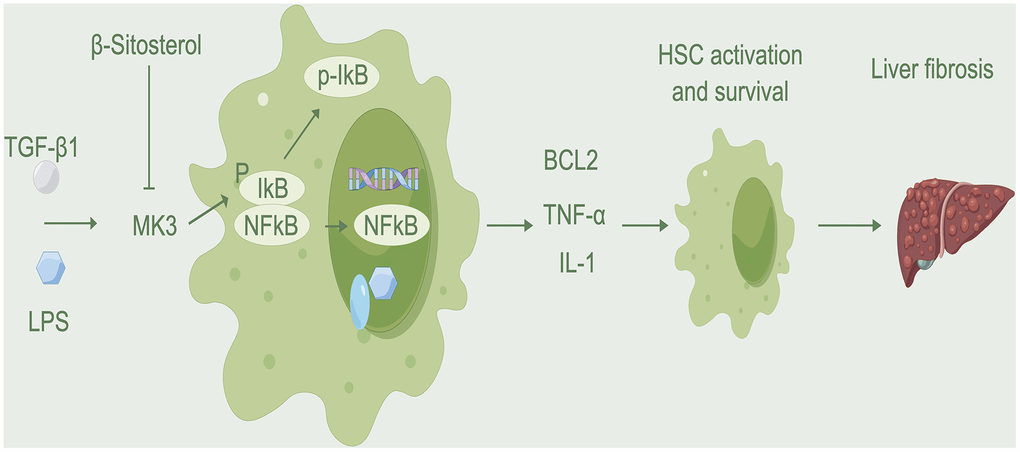 In summary, RTT can alleviate liver damage and reduce inflammatory mediators. Our hypothesis is that β-sitosterol inhibits the NF-κB pathway through MK3 modulation, reducing the binding to IκB, and encourages the apoptosis of HSCs.