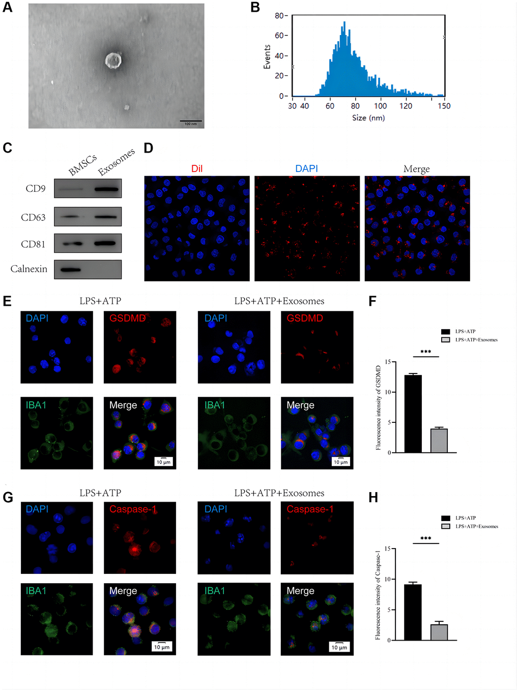 After co-culturing with BMSCs-derived exosomes, LPS+ATP was administered to BV2 cells. Figure 1E–1H shows that BMSC-derived exosomes decreased GSDMD and Caspase-1 intensity in BV2 cells in comparison to the group only treated with LPS+ATP.