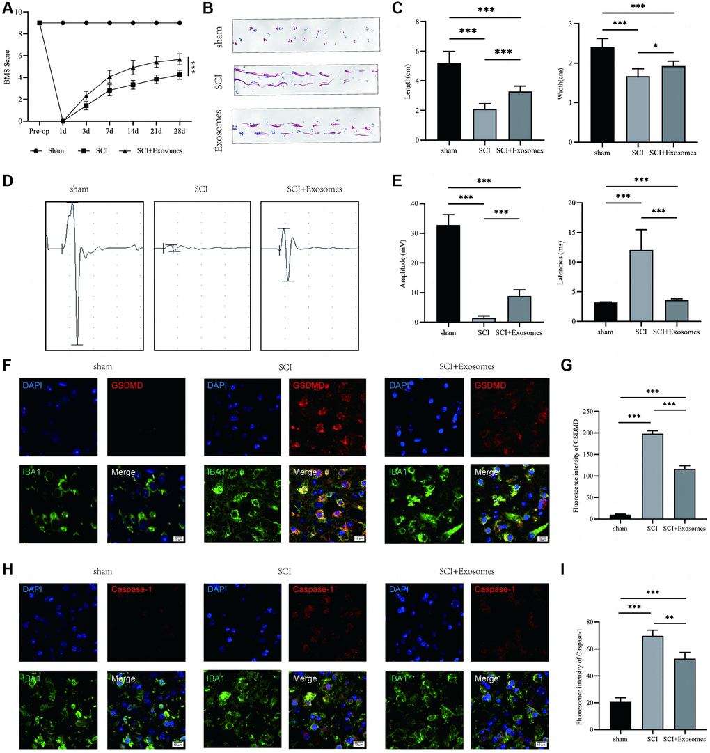 To advance the inquiry into the contribution of exosomes derived from BMSCs in the restoration of motor function and their consequential impact on macrophage/microglia pyroptosis following SCI, we administered BMSCs-derived exosomes immediately post-SCI and conducted behavioral assessments. The behavioral analysis conducted using the BMS demonstrated that the administration of exosomes sourced from BMSCs led to a noteworthy enhancement in the motor function scores of the hind limbs following SCI, as illustrated in Figure 2A. The analysis of footprints indicated that hind paw motor function in mice was compromised following spinal cord injury (SCI) in comparison to the sham group. Additionally, coordination of front and rear paw movements was notably diminished. However, the exosome group exhibited a significant improvement in motor function and coordination, as evidenced by Figure 2B, 2C. The electrophysiological examination demonstrated that mice subjected to SCI exhibited reduced motor evoked potential (MEP) amplitudes and prolonged latencies in comparison to the sham group. However, the administration of exosomes resulted in a significant restoration of the electrophysiological response, as depicted in Figure 2D, 2E. The current investigation employed NLRP3, GSDMD, GSDMD-N, Caspase-1, Caspase-1(p20), and IL-1β as indicators to assess the pyroptotic state in the traumatized spinal cord across the Sham, SCI, and BMSCs-derived exosomes cohorts [11, 25]. The utilization of immunofluorescence staining of GSDMD and Caspase-1 in macrophage/microglia demonstrated a significant augmentation in the SCI group in comparison to the Sham group, whereas the administration of BMSCs-derived exosomes resulted in a reduction in the intensity of GSDMD and Caspase-1 in relation to the SCI group (Figure 2F–2I). The present study employed Western blot analysis (Supplementary Figure 1A) to assess the expression levels of NLRP3, GSDMD, GSDMD-N, Caspase-1(p20), and IL-1β. The results revealed that the optical density (OD) values of NLRP3, GSDMD, GSDMD-N, Caspase-1(p20), and IL-1β were significantly increased in the SCI group as compared to the Sham group. Additionally, the administration of exosomes derived from BMSCs resulted in a reduction of the OD values for these markers in relation to the SCI group (Supplementary Figure 1B–1F). The results suggest that exosomes originating from BMSCs could potentially aid in the recovery of function following SCI and reduce the presence of pyroptosis-associated markers, indicating a repressive effect on pyroptosis following SCI.