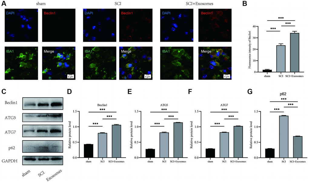 In addition, the assessment of autophagic activity in the spinal cord lesion subsequent to SCI is conducted by quantifying the protein levels of autophagy markers (Beclin1, ATG5, and ATG7) and a substrate protein for autophagy (p62). The results of immunofluorescence staining, as depicted in Figure 3A, showed that Beclin1 levels were evaluated by applying a red label for Beclin1, a green label for macrophage/microglia (IBA-1), and a blue label for nuclei (DAPI). The data presented in Figure 3B demonstrates that macrophage/microglia in the spinal cord of the SCI group exhibited a greater intensity of Beclin1 compared to the Sham group. Furthermore, treatment with BMSCs-derived exosomes resulted in a further increase in the intensity of Beclin1 in macrophage/microglia relative to the SCI group. The levels of p62, Beclin1, ATG5, and ATG7 proteins were quantified using Western blot analysis (Figure 3C). The results revealed that the OD of p62, Beclin1, ATG5, and ATG7 was significantly higher in the SCI group compared to the Sham group. The administration of exosomes derived from BMSCs elicited an elevation in the expression of Beclin1, ATG5, and ATG7, concomitant with a reduction in p62 levels in the BMSCs-derived exosomes cohort relative to the SCI group (Figure 3D–3G). The findings of this study indicate that exosomes derived from BMSCs possess the ability to enhance markers associated with the autophagosome and autolysosome while also mitigating the burden of autophagy substrates. As a result, BMSCs-derived exosomes can promote macrophage/microglia autophagy following SCI.