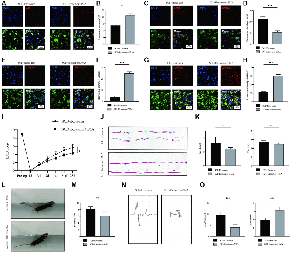 To explore the potential role of autophagy in the anti-pyroptotic mechanisms of exosomes derived from BMSCs, we utilized the autophagy inhibitor 3-MA to elucidate the underlying mechanism. Our study involved the co-administration of 3-MA with BMSCs-derived exosomes to investigate whether the favorable effects of these exosomes on outcomes following SCI are linked to autophagy activation. Immunofluorescence analysis revealed a higher density of p62 and lower levels of Beclin1 signals in the BMSCs-derived exosomes+3MA group compared to the BMSCs-derived exosomes group (Figure 4A–4D). The findings indicate that the simultaneous administration of 3MA and BMSC-derived exosomes effectively inhibited autophagy. Following this, the pyroptotic activity was evaluated through the use of immunofluorescence staining. The outcomes demonstrated a significant increase in the densities of Caspase-1 and GSDMD in macrophage/microglia in the BMSCs-derived exosome+3MA group compared to the BMSCs-derived exosome group (Figure 4E–4H). The findings indicate that the co-administration of 3MA with BMSCs-derived exosomes results in a decrease in the pyroptosis-reducing impact of BMSCs-derived exosomes. This suggests that the mechanism by which BMSCs-derived exosomes inhibit pyroptosis may be attributed to their autophagy-enhancing properties.