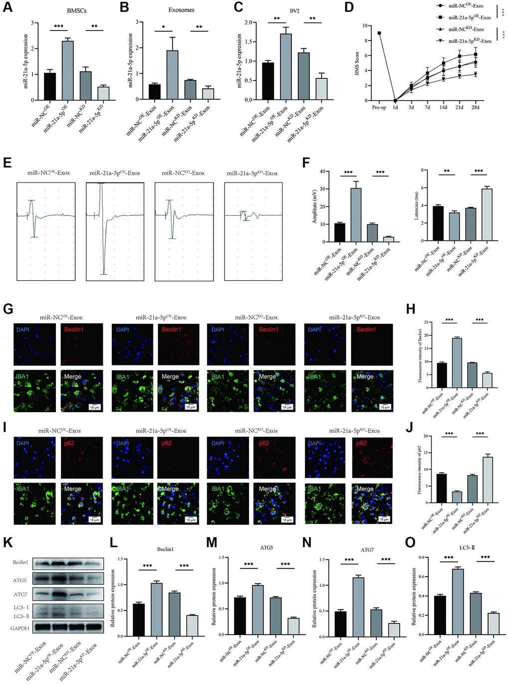 The results depicted in Figure 5G–5J demonstrate that macrophage/microglia in the miR-21a-5pKD-Exos group exhibited diminished intensity of Beclin1 and elevated intensity of p62 in the spinal cord as compared to the miR-NCKD-Exos group (Figure 5G–5J). Moreover, treatment with miR-21a-5pOE-Exos resulted in a further increase in the intensity of Beclin1 and a decrease in the intensity of p62 in macrophage/microglia, as compared to the miR-NCOE-Exos group. The Western blot technique was employed to quantify the levels of Beclin1, ATG5, ATG7, and LC3II proteins (Figure 5K). The findings indicate that the miR-21a-5pKD-Exos group exhibited a decreased optical density value of Beclin1, ATG5, ATG7, and LC3II in comparison to the miR-NCKD-Exos group. Conversely, the miR-21a-5pOE-Exos group demonstrated an elevated level of Beclin1, ATG5, ATG7, and LC3II when compared to the miR-NCOE-Exos group (Figure 5L–5O).