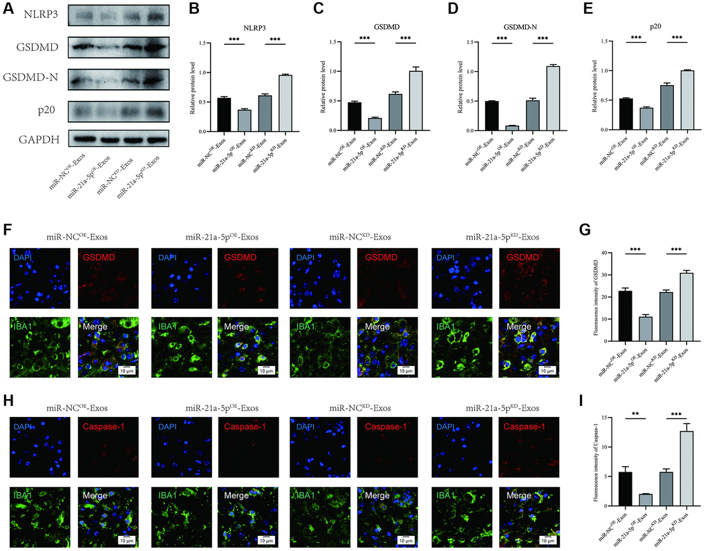 Immunofluorescence staining showed that the intensity of GSDMD and Caspase-1 in macrophage/microglia increased in the miR-21a-5pKD-Exos group compared with the miR-NCKD-Exos group, and miR-21a-5pOE-Exos treatment further decreased the intensity of GSDMD and Caspase-1 in macrophage/microglia compared with the miR-NCOE-Exos group (Figure 6F–6I). The findings of this study indicate that exosomes derived from BMSCs facilitated autophagy and mitigated pyroptosis in macrophage/microglia subsequent to SCI through the involvement of miR-21a-5p.