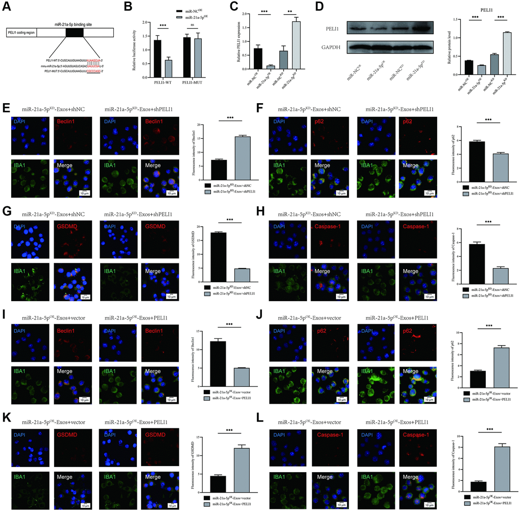 To examine the association between exosomal miR-21a-5p and PELI1, a set of in vitro rescue experiments were performed. The suppression of PELI1 expression in BV2 cells was achieved via shRNA administration. The outcomes indicated that inhibiting PELI1 during co-treatment with miR-21a-5pKD-Exos facilitates macrophage/microglial autophagy while simultaneously mitigating the activation of macrophage/microglial pyroptosis (Figure 7E–7H). Furthermore, the overexpression of PELI1 in macrophage/microglia was achieved through transfection with a PELI1 lentivirus. The findings indicated that the overexpression of PELI1 led to a decrease in macrophage/microglia autophagy and an increase in the activation of macrophage/microglia pyroptosis when co-treated with miR-21a-5pOE-Exos (Figure 7I–7L). The rescue experiments conducted have demonstrated that miR-21a-5p has the ability to enhance macrophage/microglia autophagy and suppress macrophage/microglia pyroptosis by targeting PELI1.