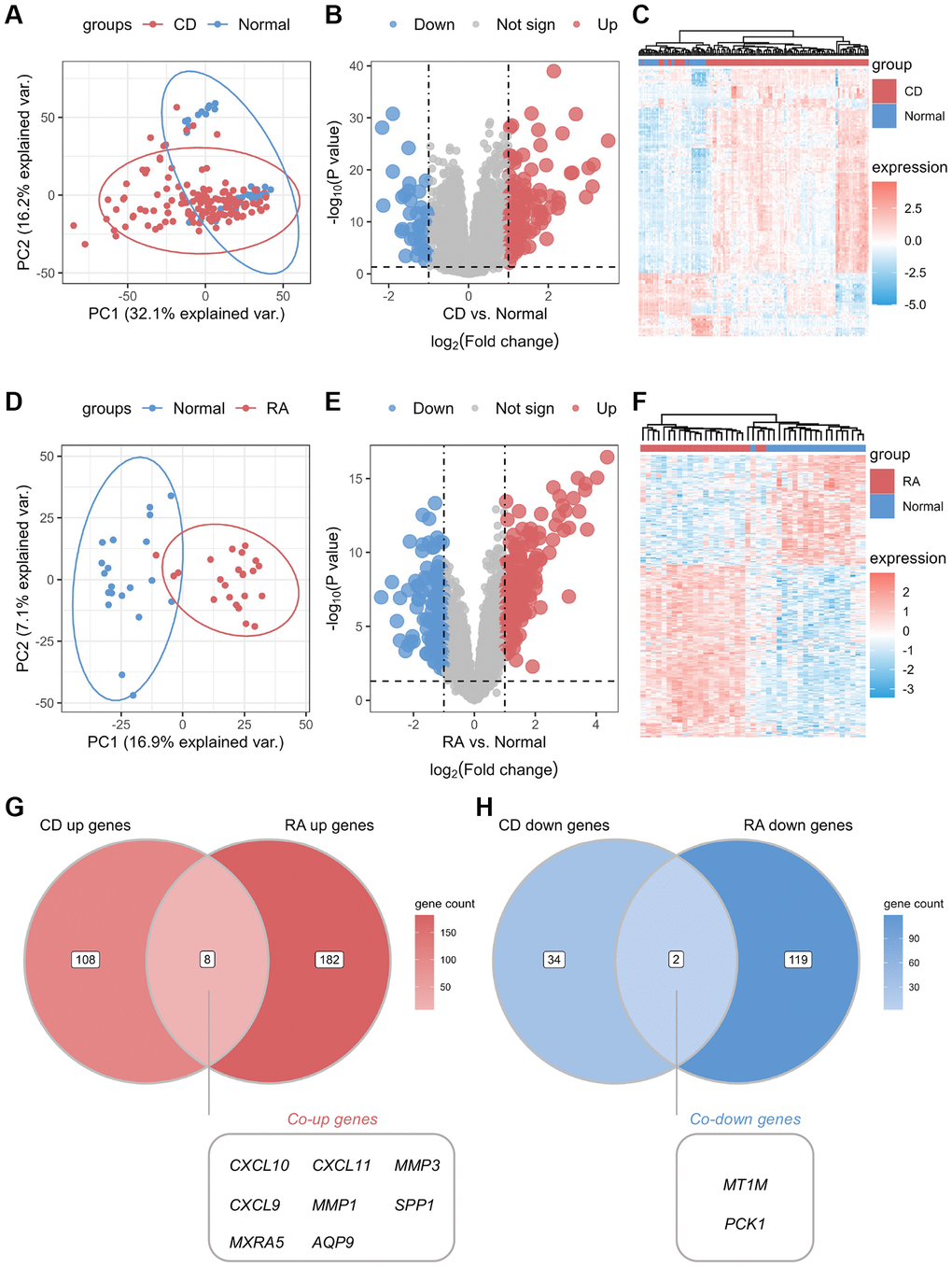 Differential gene analysis was performed using the R package “limma.” The criteria for identifying DEGs were defined as a |log2 fold change| > 1 with a P-value <0.05. Volcano plots and heatmaps depicting the DEGs were generated using the “ggplot2” and “ggpheatmap” functions. The DEGs that were observed in both the CD and RA datasets were identified and represented visually using the R package “ggVennDiagram.”