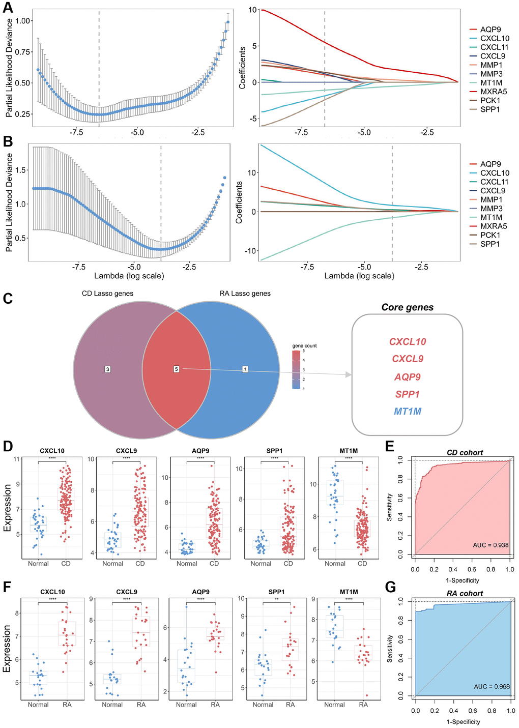 To identify the core DEGs implicated in the pathological manifestations of CD and RA, we performed LASSO regression with 10-fold cross-validation using the common DEGs identified. The core genes for CD and RA were identified based on the best lambda values obtained (Figure 3A, 3B). We identified five genes (CXCL10, CXCL9, AQP9, SPP1, and MT1M) that were present in both CD and RA in the best LASSO model when comparing the results (Figure 3C). Therefore, we considered these five genes as core DEGs and formed a novel biomarker panel for subsequent analysis. Expression analysis of these core DEGs in the biomarker panel showed significantly higher levels of CXCL10, CXCL9, AQP9, and SPP1 in lesion tissues compared to normal tissues (Figure 3D, 3F). In contrast, MT1M expression was significantly lower in lesion tissues. To assess the diagnostic utility of the biomarker panel for CD and RA, we conducted ROC analysis, which suggested that the biomarker panel exhibited outstanding discriminatory performance in the discovery cohort (AUC = 0.938 and 0.968, respectively) (Figure 3E, 3G). These results underscore the pivotal roles played by these biomarkers in the pathogenesis of CD and RA. However, we found that the expression levels of these core biomarkers in several other inflammatory diseases, such as UC and osteoarthritis (OA), were not consistent with those in the CD and RA cohorts (Supplementary Figure 1).