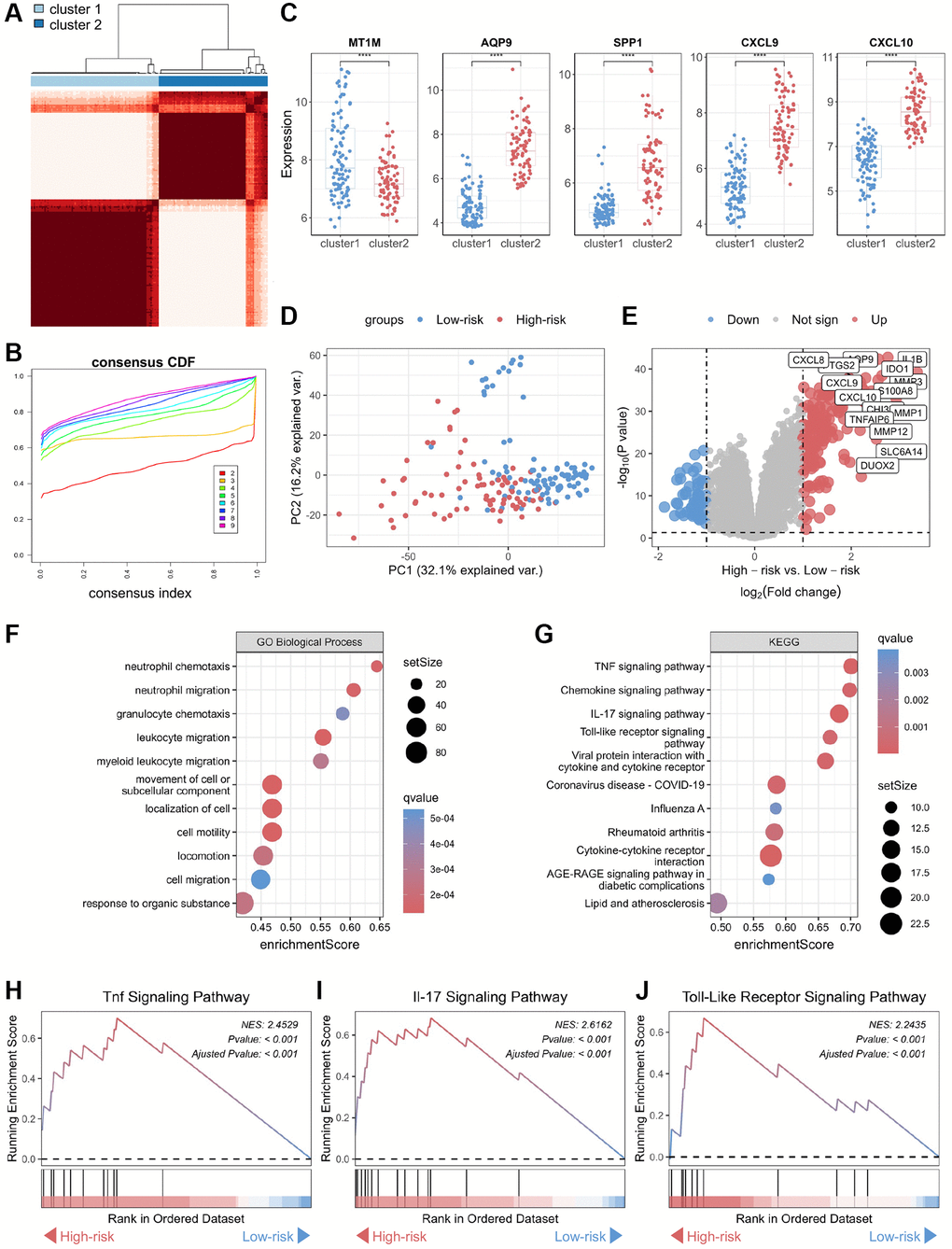 To further explore the involvement of the core biomarkers in disease pathogenesis, we subdivided the CD cohort into two novel CD subtypes, namely cluster 1 and cluster 2, based on a consensus clustering approach applied to the biomarker panel (Figure 4A, 4B). Subsequently, we verified the expression of these core biomarkers in both subtypes, and the results showed that the expression levels of four genes — CXCL10, CXCL9, AQP9, and SPP1 — were significantly higher in cluster 2 than in cluster 1 (Figure 4C). In contrast, MT1M displayed a significantly lower expression level in cluster 1 as opposed to cluster 2, consistent with the expression patterns of these core biomarkers in normal and CD samples. Therefore, cluster 2 was defined as “high-risk” for CD occurrence and progression, while cluster 1 was categorized as “low-risk.” Furthermore, an unsupervised clustering PCA demonstrated a significant difference between the high-risk and low-risk groups (Figure 4D). A volcano plot showcased differences in gene expression between these two groups, highlighting genes with significantly elevated expression levels in the high-risk group (Figure 4E). Functional annotation of the DEGs showed that the key biological processes linked to the biomarker panel identified in this study encompassed neutrophil chemotaxis, neutrophil migration, granulocyte chemotaxis, and leukocyte migration (Figure 4F). Additionally, KEGG analysis showed that tumor necrosis factor (TNF), chemokine, interleukin-17 (IL-17), and toll-like receptor (TLR) signaling pathways are most closely associated with the biomarker panel (Figure 4G). Furthermore, GSEA demonstrated significant upregulation of TNF, IL-17, and TLR signaling pathways in the high-risk group compared to the low-risk group (Figure 4H–4J).