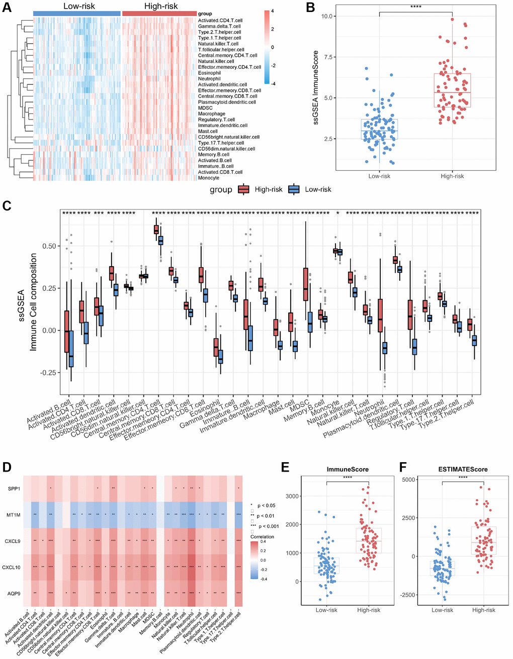We performed immune infiltration analyses on CD subtypes using the ssGSEA algorithm. The results showed significant differences in immune cell infiltration levels and immune scores between the high-risk and low-risk groups (Figure 5A, 5B). The bowel tissues from the high-risk group exhibited higher levels of immune cell infiltration, including macrophages, neutrophils, T helper type 1 (Th1) cells and T helper type 17 (Th17) cells, than those in the bowel tissues from the low-risk group (Figure 5C). Employing Spearman correlation analysis, we confirmed that the expression levels of CXCL10, CXCL9, AQP9, and SPP1 were significantly and positively correlated with the numbers of most immune cell types in the immune infiltrates; however, the most significant correlation was observed with neutrophils (Figure 5D). In contrast, MT1M expression levels exhibited a negative correlation with immune cell infiltration levels. In addition, we assessed immune infiltration levels in the high-risk and low-risk groups using the ESTIMATE and CIBERSORT algorithms. The results were consistent with those obtained through the ssGSEA algorithm, the high-risk group displayed higher levels of immune infiltration compared to those from the low-risk group (Figure 5E, 5F; Supplementary Figure 3).