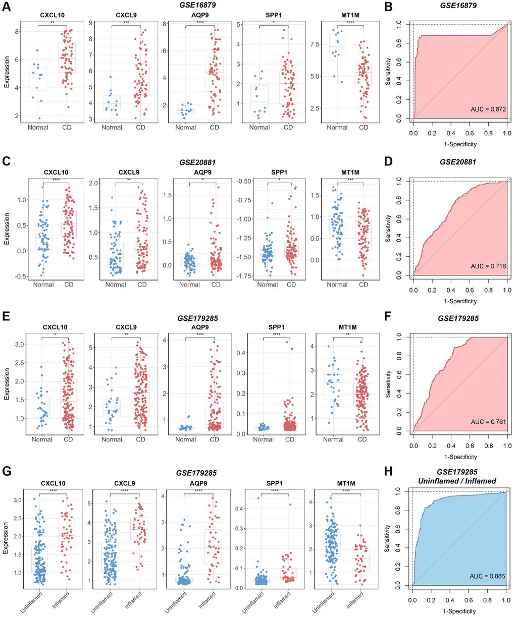 We validated the identified biomarkers by assessing the expression levels of the genes in several independent GEO datasets. The results indicated elevated expression levels of CXCL10, CXCL9, AQP9, and SPP1 in CD samples across the CD datasets GSE16879, GSE20881, and GSE179285, aligning with our initial findings in the discovery CD cohort (Figure 6A, 6C, 6E). In contrast, MT1M exhibited reduced expression levels in CD samples compared to normal samples. All selected biomarkers exhibited robust discriminatory performance between CD samples and normal samples (AUC = 0.872, AUC = 0.716, and AUC = 0.761 for GSE16879, GSE20881, and GSE179285, respectively), as determined through 10-fold cross-validated ROC analysis (Figure 6B, 6D, 6F). In the GSE179285 dataset, CXCL10, CXCL9, AQP9, and SPP1 displayed increased expression in samples with inflammation, while MT1M exhibited higher expression levels in samples without inflammation (Figure 6G). The selected biomarkers also demonstrated strong discriminative performance between samples with inflammation and those without inflammation (AUC = 0.886) (Figure 6H).