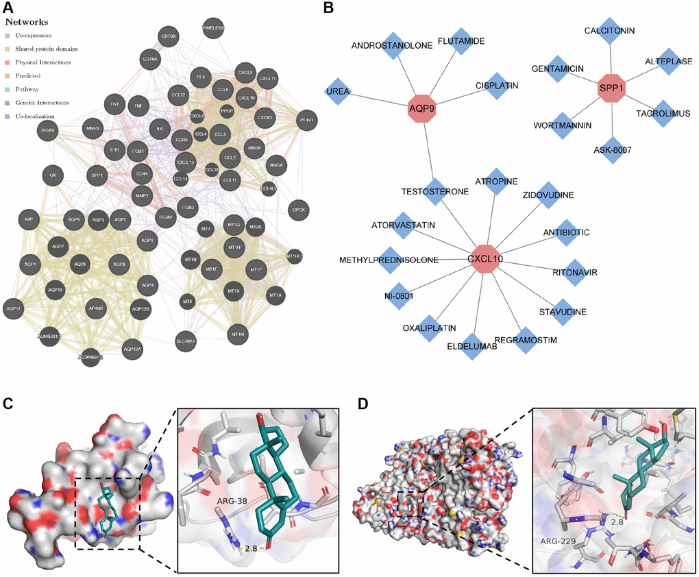 To elucidate the molecular mechanisms underlying the influence of the selected biomarkers on disease pathology, we initially constructed an miRNA–mRNA co-expression network for these biomarkers. The results showed that 55 miRNAs possessed the potential to target these core biomarkers. Among these, miR-181c-5p emerged as a candidate capable of targeting both CXCL9 and SPP1 (Supplementary Figure 6). In addition, we established a protein–protein interaction network by leveraging data from the STRING and GeneMANIA databases (Figure 7A). Subsequently, we employed the DGI database to identify compounds with the potential to inhibit the functions of these biomarkers, leading to the identification of 22 compounds targeting CXCL10, AQP9, and SPP1 proteins (Figure 7B). Among these compounds, testosterone emerged as a potential co-acting compound with the ability to target AQP9 and CXCL10. The binding of testosterone to CXCL10 and AQP9 was subsequently confirmed through molecular docking simulations. The results showed that testosterone formed hydrogen bonds with Arg-38 in CXCL10 at a distance of 2.8 Å (Figure 7C) and with Arg-229 in AQP9 at a similar distance of 2.8 Å (Figure 7D). These results suggest that testosterone can be used to target CXCL10 and AQP9.