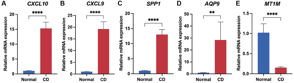 To validate the expression of the biomarker panel, we performed q-PCR on both CD lesions and normal intestinal tissues. The human intestinal tissues utilized in this research were sourced from patients undergoing intestinal resection at the Department of Gastrointestinal Surgery, Shandong Provincial Third Hospital, with all patients consenting through signed informed consent forms. The Crohn's Disease (CD) lesion tissues were obtained from CD patients who underwent local intestinal resection, while the normal intestinal tissues were obtained from constipated patients who underwent total colectomy. The results demonstrated significant upregulation of four genes, specifically CXCL10, CXCL9, AQP9, and SPP1, in CD-afflicted tissues (P < 0.05) (Figure 8A–8D). Conversely, MT1M exhibited heightened expression levels in normal tissues (P < 0.05) (Figure 8E). Furthermore, the expression of the five genes in the biomarker panel was verified using serum samples from patients with and without RA. The results indicated elevated levels of CXCL10, CXCL9, AQP9, and SPP1 in the serum of patients with RA (P < 0.05), while M1TM demonstrated lower expression in the serum of patients with RA (P < 0.05) (Supplementary Figure 7). These results were consistent with the transcriptomic data, affirming the reliability of the biomarker panel.