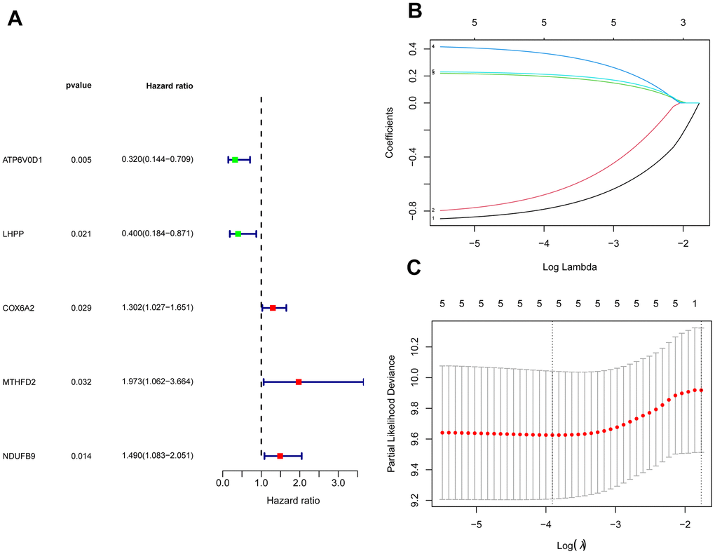 Using the oxidative phosphorylation-related genes screened out above, the model was constructed based on the training set data. Differential genes above 0.5-fold were screened using GSE28425, whereas univariate Cox regression analysis was conducted to screen prognostic oxidative phosphorylation-related genes. Subsequently, LASSO regression analysis was conducted to calculate the risk coefficient (coefi) of all oxidative phosphorylation-related genes. To compute the risk score for every individual, the expression (expi) and coefficient (coefi) values of all oxidative phosphorylation genes related to prognosis were added. This was done for every sample in the study, and the resulting value was considered as the risk score of the patient (risk score = (coefi × expri)). By utilizing the median value of risk scores, individuals were classified into high- and low-risk groups. In order to examine whether a noteworthy disparity in the overall survival of individuals between both groups existed, a Kaplan-Meier survival analysis was conducted. The capability of the risk scoring model for making predictions was analyzed by calculating the area under the curve (AUC) using receiver operating characteristic (ROC) curve analysis.
