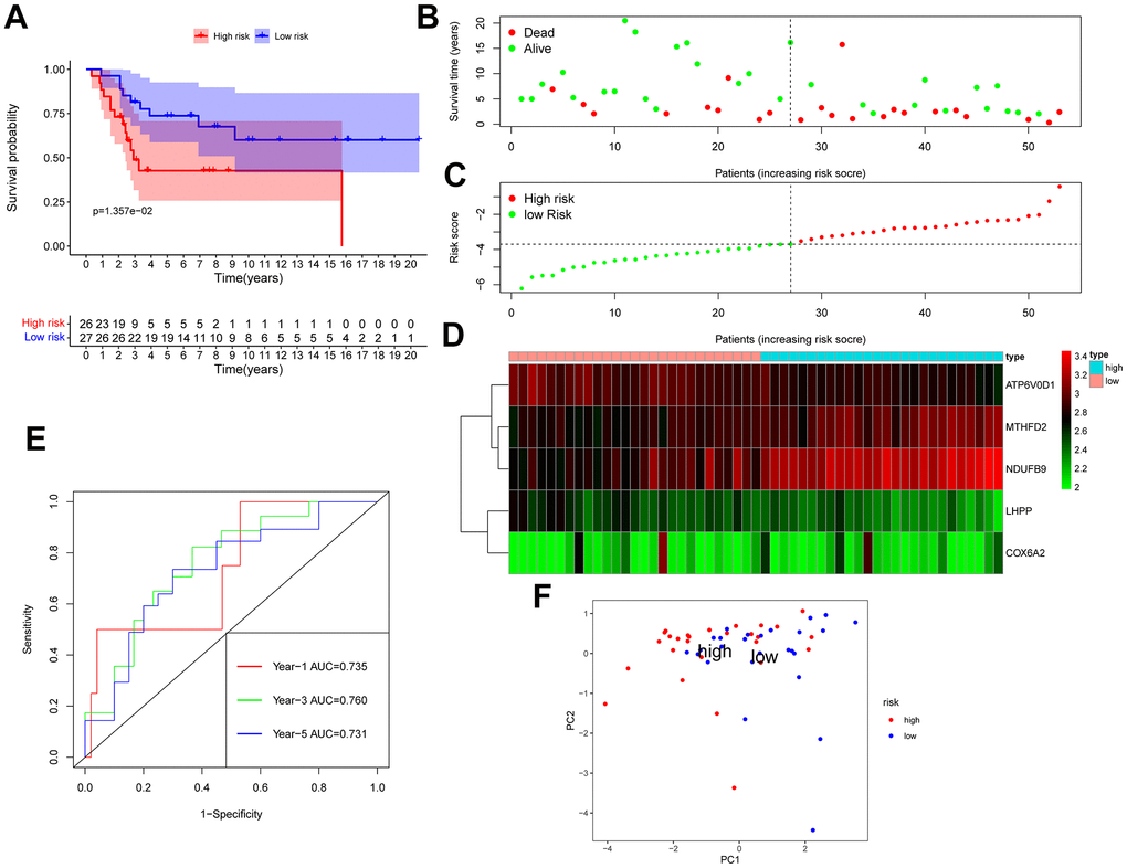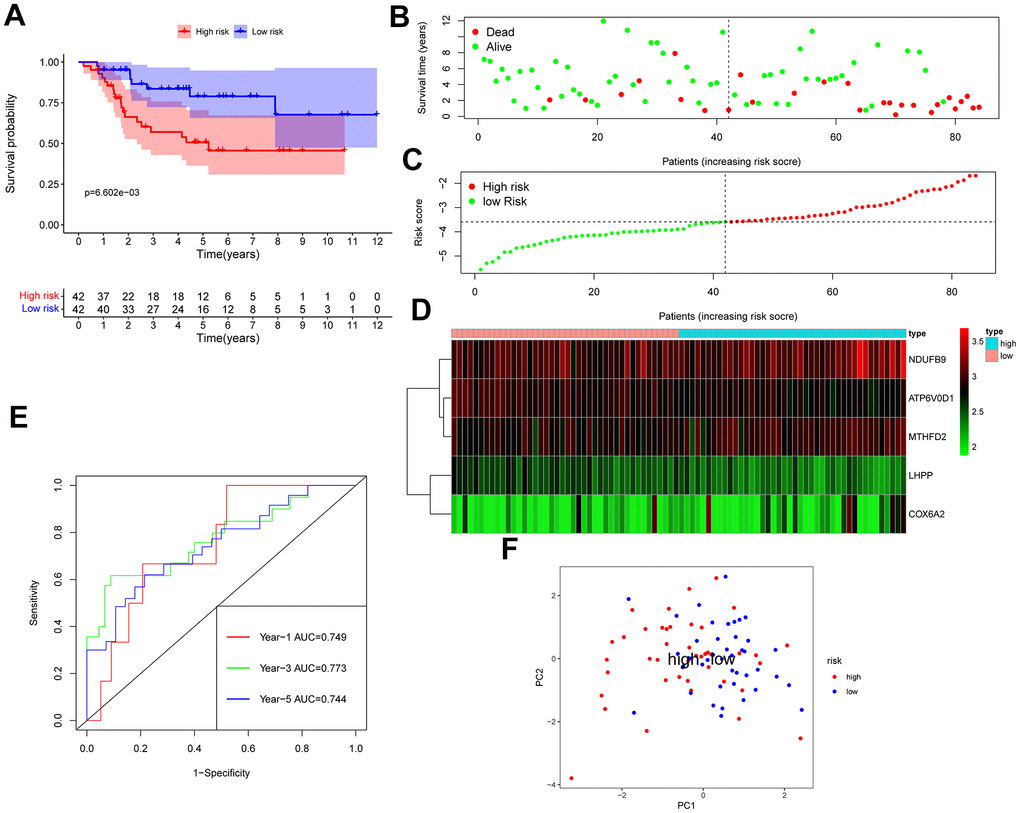 Osteosarcoma seriously affects the health of adolescents and can be metastasized to the lung and other tissues in the early stage [11]. Numerous reports have confirmed the significant role of oxidative phosphorylation in the malignant progression of tumors. Additionally, oxidative phosphorylation is considered to be the key mechanism of energy metabolism in osteosarcoma [2, 10, 12]. Therefore, investigating oxidative phosphorylation-related genes in osteosarcoma becomes crucial for predicting the prognosis of patients and identifying potential therapeutic targets. In this research, five oxidative phosphorylation genes linked to the prognosis of individuals with osteosarcoma were screened out, including ATP6V0D1, LHPP, COX6A2, MTHFD2, and NDUFB9. Among them, COX6A2, MTHFD2, and NDUFB9 were positively correlated with risk scores, suggesting that they were risk genes for unfavorable prognosis among individuals with osteosarcoma. On the other hand, ATP6V0D1 and LHPP were negatively correlated with risk scores, which suggested that they are protective genes for the clinical prognosis of patients with osteosarcoma.
