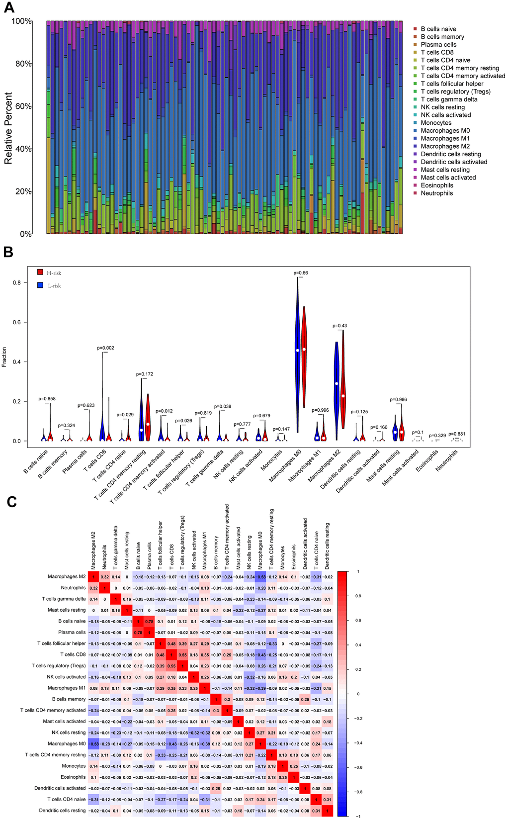 The abundance of 22 types of immune cells in both risk groups (high and low) was calculated by utilizing the CIBERSORT algorithm (https://cibersortx.stanford.edu/). Additionally, high and low groups were established as per the median expression of different immune cells, and the difference in survival time across the two groups was determined. The ESTIMATE (Estimation of Stromal and Immunological Cells in Malignant Tumor Tissues using Expression Data) algorithm was employed to assess the stromal, immunological, and ESTIMA scores, as well as the tumor purity of various molecular subgroups. Ultimately, the association of genes with immune cells was examined.