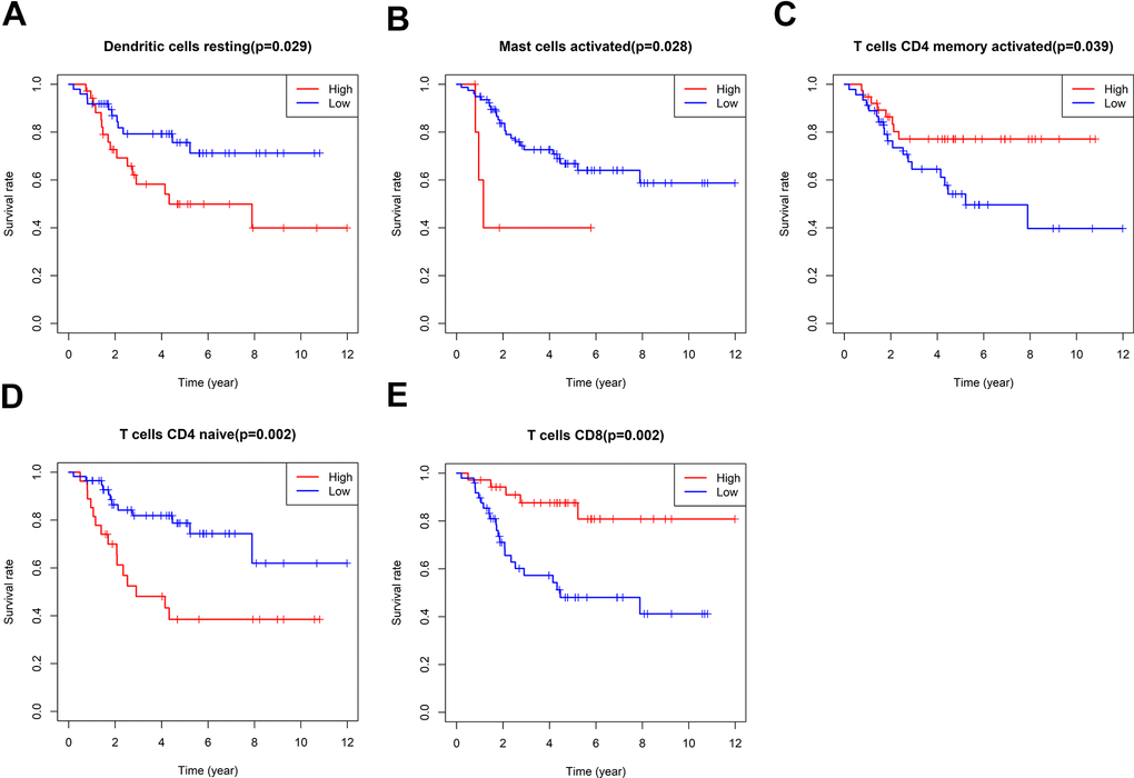 According to the relative proportion of 22 immune cells, TCGA osteosarcoma patients were classified into high- and low-risk groups. The impact of various types of immune cells on the survival of osteosarcoma was examined by employing Kaplan-Meier survival analysis. The outcomes highlighted that individuals with a higher proportion of CD8+T cells and activated CD4 memory T cells experienced a more favorable prognosis. On the other hand, patients with a higher proportion of resting dendritic cells, activated mast cells, and immature CD4 T cells demonstrated a poorer prognosis (Figure 6). In addition, the link between oxidative phosphorylation-related differentially expressed genes (DEGs) and immune cells in risk scores and five risk-scoring models was compared. The risk score exhibited a positive link to activated CD4 naive T cells and mast cells while showing an inverse link to activated CD4 memory T cells, CD8+T cells, and follicular helper T cells (Supplementary Figure 5). The expression of the ATP6V0D1 gene was proportional to M1 macrophages, CD8+T cells, and M2 macrophages, and inversely proportional to activated mast cells, M0 macrophages, and CD4 naive T cells (Supplementary Figure 6). Moreover, LHPP gene expression was positively correlated with CD8+T cells and follicular helper T cells, while negatively correlated with CD4 naive T cells (Supplementary Figure 7). The expression of the COX6A2 gene was proportional to naive B cells and inversely proportional to memory B cells (Supplementary Figure 8). MTHFD2 gene expression was not linked to the 22 immune cells examined in this study. NDUFB9 gene expression was proportional to activated mast cells and monocytes (Supplementary Figure 9). Furthermore, the low-risk group exhibited statistically higher matrix, immune, and ESTIMATE scores (matrix score plus immune score). Moreover, the low-risk group exhibited a higher PDCD1LG2 expression, suggesting that this group might be more responsive to PD1 combined with immunosuppressive therapy (Supplementary Figure 10).