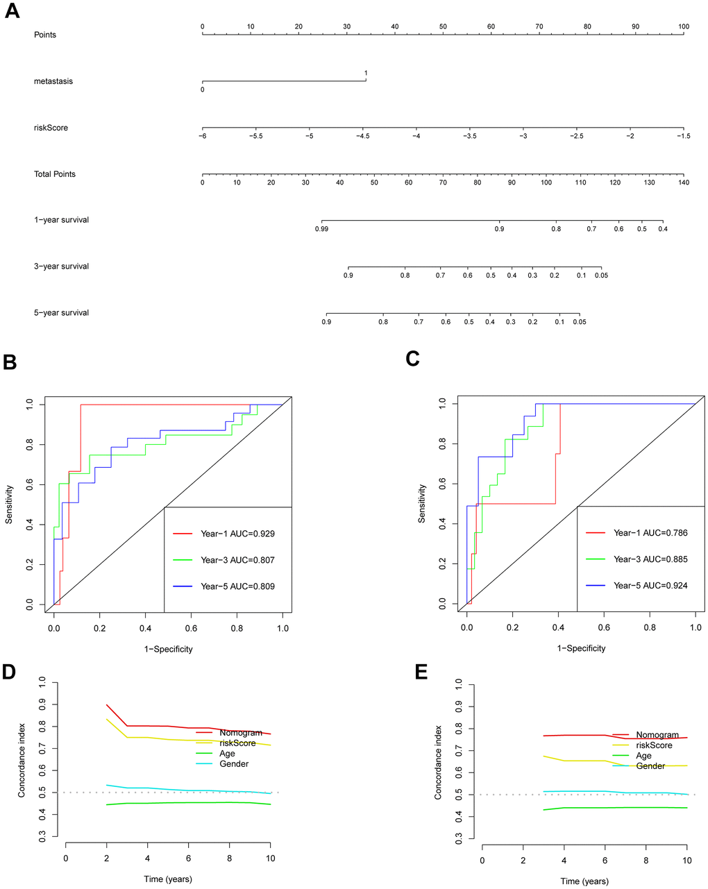 Univariate and multivariate Cox regression analyses were conducted to explore the link between gender, age, metastasis, risk-scoring, and prognosis of individuals who suffer from osteosarcoma (Supplementary Figure 12A, 12B). The findings demonstrated that both metastasis and risk score were identified as independent predictors of prognoses for individuals suffering from osteosarcoma. The 1-, 3-, and 5-year OS of the patients were predicted using a nomogram that took the outcomes of multivariate Cox regression into account (Figure 7A). This nomogram included the risk-scoring index of the patient and whether the patient had metastasis. The predicted performance results of the nomogram estimated by the ROC curve highlighted that the respective AUC values of 1-, 3-, and 5-year OS of the training set were 0.929, 0.807, and 0.809 (Figure 7B). However, the respective AUC values of 1-, 3- and 5-year OS of the verification set were 0.786, 0.885, and 0.924 (Figure 7C). The C index also highlighted a good predictive performance exhibited by the prognosis model (Figure 7D, 7E).