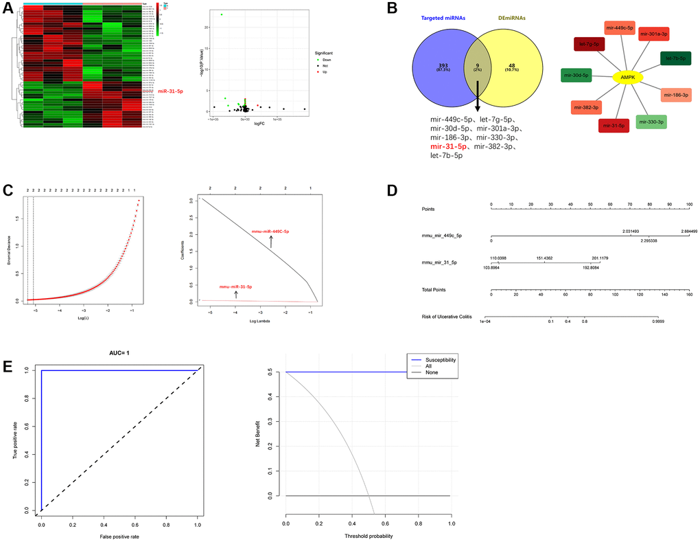 Of the 9 core miRNAs molecules, mmu-miR-449C-5p and mmu-miR-31-5p were selected as the best predictive molecules by LASSO regression (Figure 1C). Nomogram showed that the higher the scores of mmu-miR-449C-5p and mmu-miR-31-5p, the higher the risk of being diagnosed with UC (Figure 1D). The C-index showed that the model discrimination performance was 1, the area under the receiver operating characteristic curve (ROC) was equal to 1, and the clinical decision curve (DCA) showed two molecules of nomogram to diagnose UC had an additional benefit over all UC or all non-UC diagnoses [17]. Therefore, the internal verification of the model proved the correctness of the model (Figure 1E). Since the difference factor of miR-31-5p was more significant, this study took miR-31-5p as the research focus.