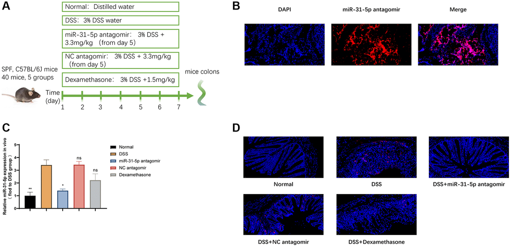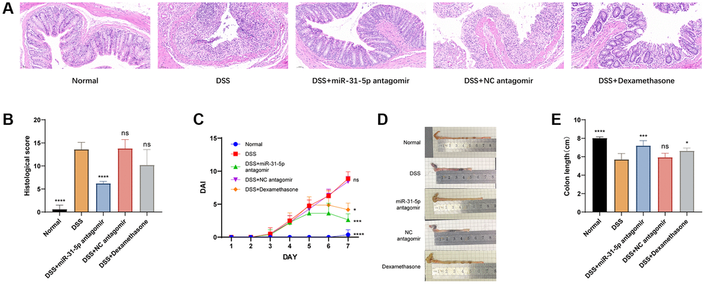 All mice acclimated to the environment for 7 days. The 40 mice were then randomly divided into five groups, each containing 8 mice: Normal control group (normal group), Dextran sodium sulfate (DSS) induced model group (DSS group), miR-31-5p antagomir group, negative control group (NC antagomir group), and positive control group (dexamethasone injection group). Mice were given 3.0% DSS (36–50K DA; MP Biomedicals, Irvine, CA, USA) fresh drinking water for 7 days, except for the normal group. In the meantime, starting on the fifth day, the miR-31-5p antagomir and NC antagomir groups were treated by intraperitoneal injection of miR-31-5p antagomir (Tsingke) and corresponding negative control (Tsingke) using a 1ml syringe at 3.3 mg/kg (2OD) daily dose for three consecutive days. The antagomir is cholesterol-modified at the 3′ end, bearing two exocyclic modifications at the 5′ end, and four exocyclic modifications at the 3′ end, along with full-chain methoxy modification. These modifications serve to enhance the in vivo stability of antagomir, enabling it to exert a sustained biological effect without inducing undesirable side effects. The in vivo experimental administration method of antagomir is as previously described [10]. The other groups were given equal volumes of PBS. The dexamethasone group was treated with 1 ml syringe intraperitoneal injection of 1.5 mg/kg dexamethasone injection daily.