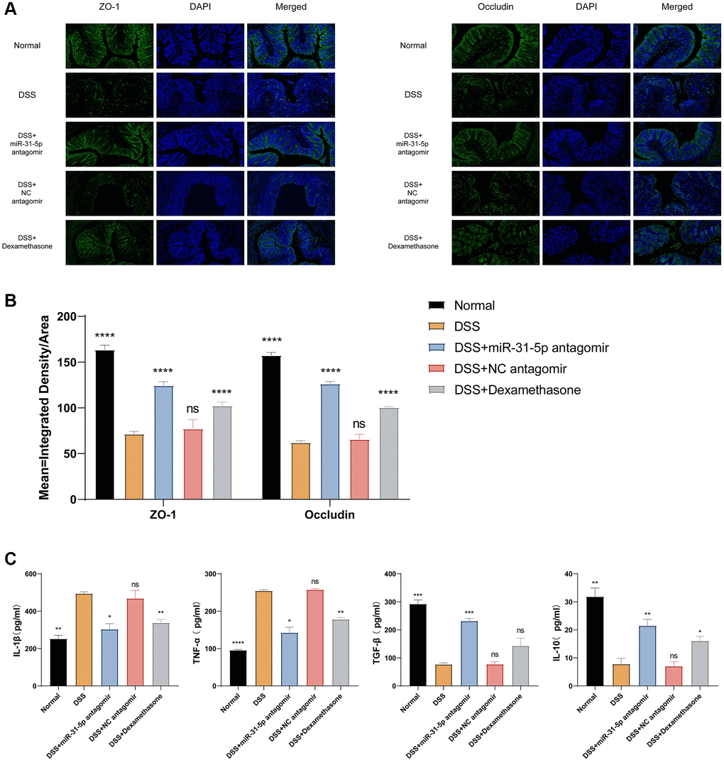Apart from detecting tight junctions, we also measured inflammatory and anti-inflammatory cytokine levels in the serum of mice by ELISA assay as a proxy for the intestinal inflammatory status of mice in different treatment groups. We can see that the proinflammatory cytokines IL-1β and TNF-α were increased in the DSS group, while the effect of antagomir of miR-31-5p can reduce their expression. On the contrary, the anti-inflammatory cytokine IL-10 decreased in the DSS group, the intervention of miR-31-5p antagomir could restore its expression, and the expression of TGF-β showed a similar trend to that of IL-10 (Figure 4C).