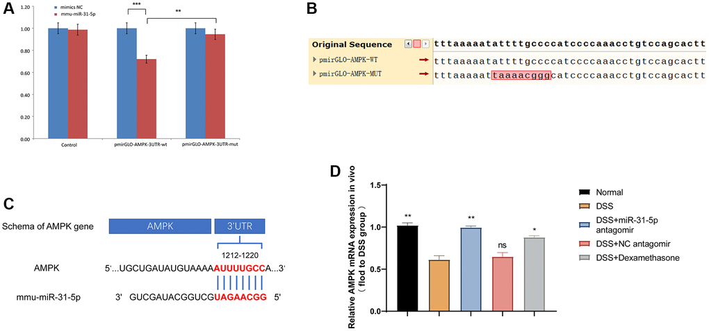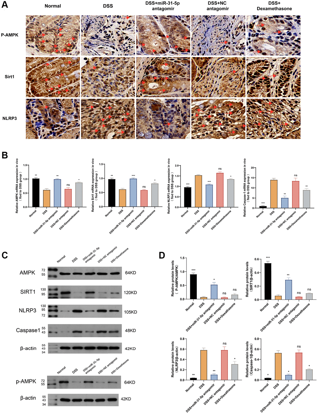 AMPK can form a positive feedback loop with its downstream target Sirt1 to ameliorate colitis. Sirt1, a protein regulated by deacetylase, has effects in antioxidation, metabolism regulation, immunity, and enhances intestinal barrier integrity by increasing tight junction proteins [21]. Recent studies show that sirt1 reduces NLRP3 inflammasomes, improving microglia-induced inflammatory response and polarization [22]. Immunohistochemistry revealed changes in the AMPK/Sirt1/NLRP3 axis. miR-31-5p inhibited AMPK expression, leading to down-regulation of Sirt1 and increased expression of NLRP3. The use of miR-31-5p antagomir can reverse this trend (Figure 6A). In the DSS group, mRNA levels of AMPK and Sirt1 decreased compared to the normal group, but miR-31-5p antagomir intervention restored mRNA levels (P < 0.01) better than the dexamethasone group. NLRP3 and caspase-1, downstream inflammatory factors, increased in the DSS group, but miR-31-5p antagomir reduced their levels (P < 0.01) (Figure 6B). Western blotting showed decreased levels of p-AMPK (Thr172) and Sirt1 in the DSS group at the protein level, which were reversed by the addition of miR-31-5p antagomir. NLRP3 and caspase-1 showed the opposite pattern (Figure 6C). Protein quantitative analysis confirmed these findings (Figure 6D). These results suggest that the AMPK/Sirt1/NLRP3 axis may be targeted by miR-31-5p, leading to colonic mucosal inflammation in DSS-induced colitis.