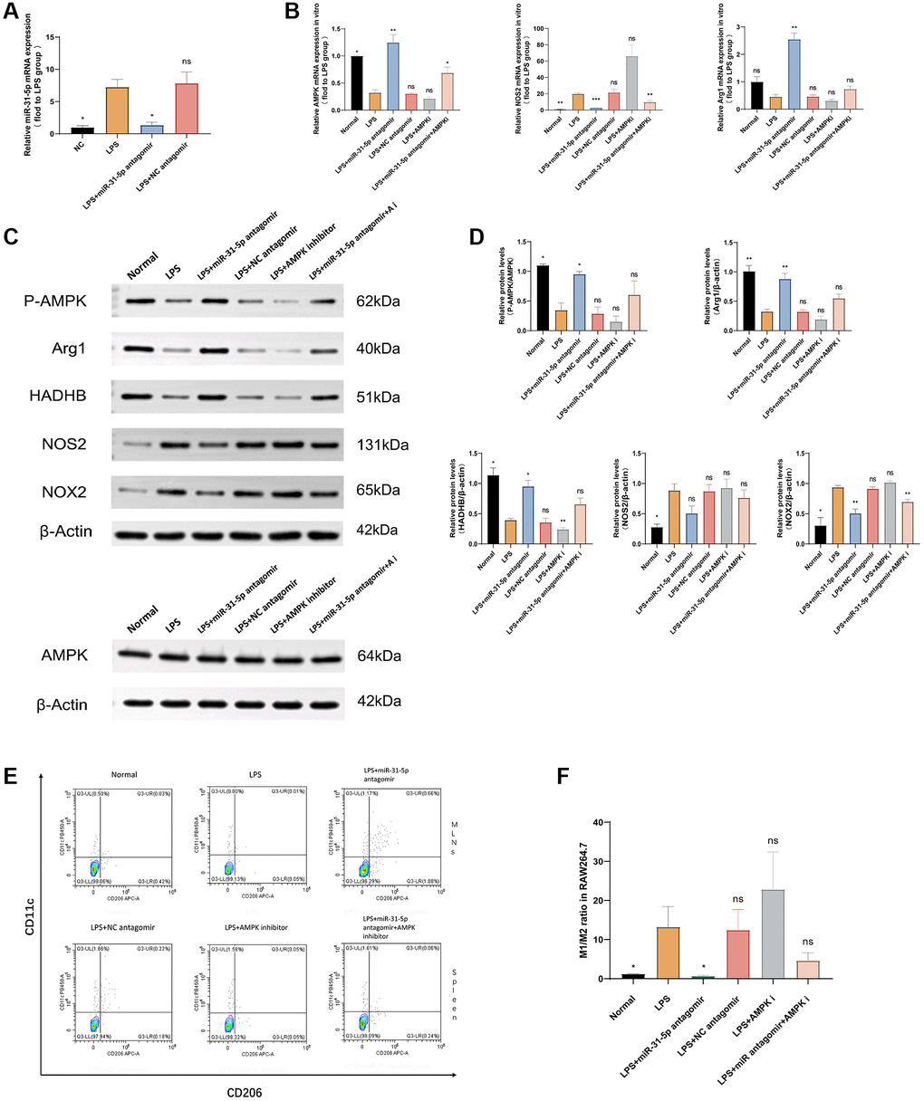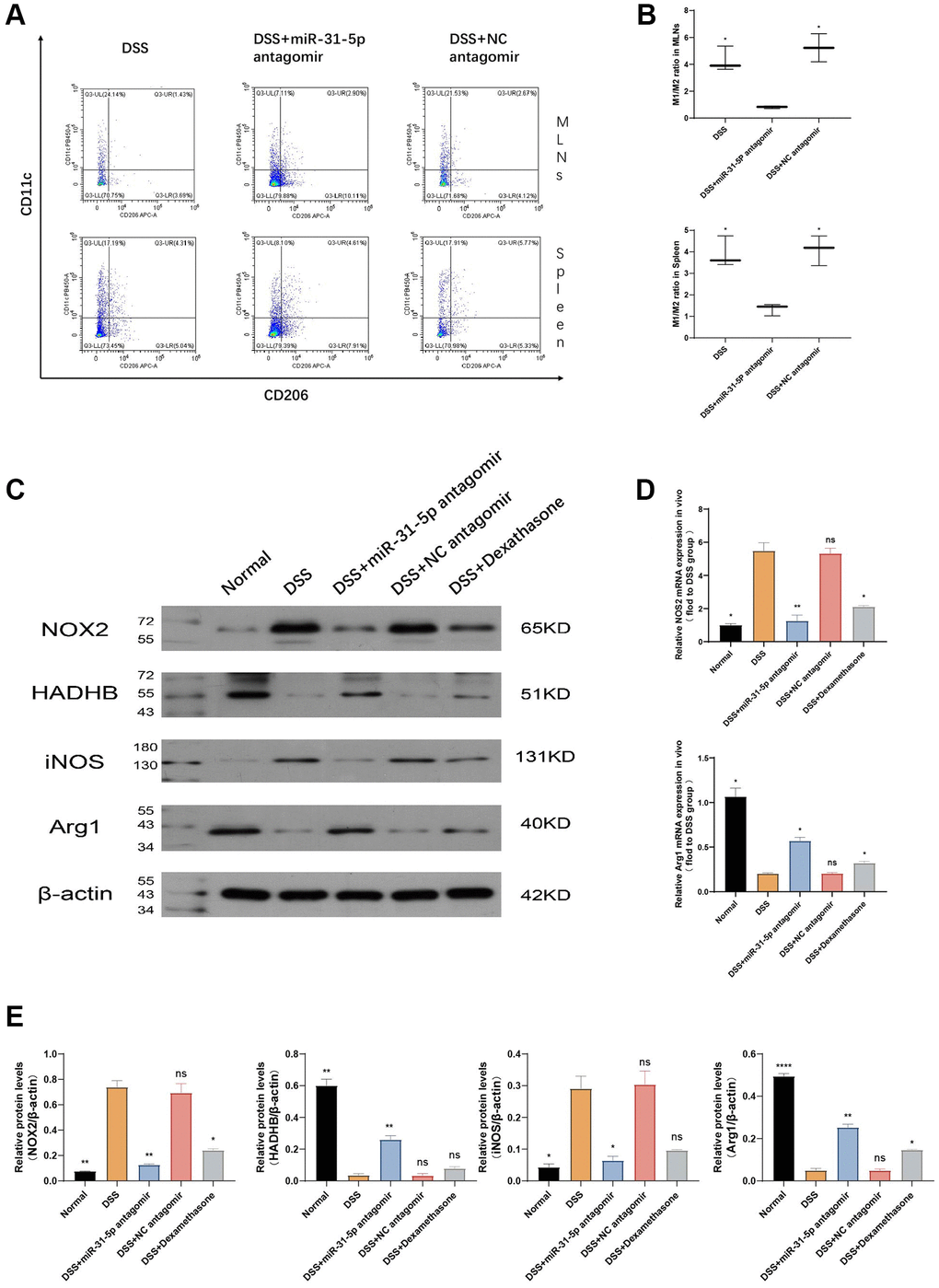 Since the AMPK pathway is one of the classical pathways in macrophage polarization, we next investigated the ratio of CD45+F4/80+CD11c (M1) and CD45+F4/80+CD206+ (M2) in mouse spleen and MLNs nodes by flow cytometry (Figure 7A). The results showed that, compared with the DSS group, miR-31-5p antagomir could reduce the M1/M2 ratio of spleen and MLNs, which means that miR-31-5p antagomir could change the polarization state of macrophages from proinflammatory to anti-inflammatory (P < 0.05). The significance of flow analysis results can be seen in Figure 7B. The classic proinflammatory M1-type macrophage subtype is characterized by increased aerobic glycolysis and reduced oxidative phosphorylation (OXPHOS). In contrast, the subtype of M2-type anti-inflammatory macrophages is characterized by Fatty Acid Oxidation (FAO) and OXPHOS. HADHB is a subunit of mitochondrial trifunctional protein (MTP) that catalyzes the last three steps of fatty acid oxidation, while glycolysis increases NADPH oxidase 2 (NOX2) activity. Therefore, we analyzed the expression of HADHB protein and NOX2 by Western blotting (Figure 7C) [23]. The results confirmed the idea, compared with the normal group, NOX2 protein expression levels in the DSS group were sharply increased (P < 0.01), while the expression of HADHB was significantly reduced (P < 0.01). Our research also demonstrated that miR-31-5p antagomir can restore HADHB, a protein related to oxidative phosphorylation, and reduce NOX2, a protein related to glycolysis, to convert pro-inflammatory M1 to anti-inflammatory M2 (P < 0.01) (Figure 7E). It is well known that nitric oxide synthase 2 (NOS2) and Arginase 1 (Arg1) are markers of M1-type macrophages and M2-type macrophages, respectively [24]. We then verified by qPCR and WB at mRNA and protein levels, respectively, that compared with the normal group, NOS2 was increased and Arg1 was decreased in the DSS group (P < 0.05), and the addition of miR-31-5p antagomir could reverse this damage (P < 0.05), further indicating that M1 was converted to M2 (Figure 7C–7E). From the gene and protein expression analysis of M1-type and M2-type related factors, all the results emphasized that DSS caused the increase of M1 proinflammatory and the decrease of M2 anti-inflammatory in mice colon, and the intervention of mir-31-5p antagomir promoted the transformation of M1 to M2 phenotype. Our study has previously demonstrated that mir-31-5p can target the AMPK pathway and exert its damaging effect. AMPK is strongly correlated with macrophages, as well as miR-31-5p also leads to a rise in proinflammatory macrophages. Consequently, it is reasonable to assume that mir-31-5p antagomir can specifically convert M1 to M2 by the AMPK route and relieve colitis in mice.