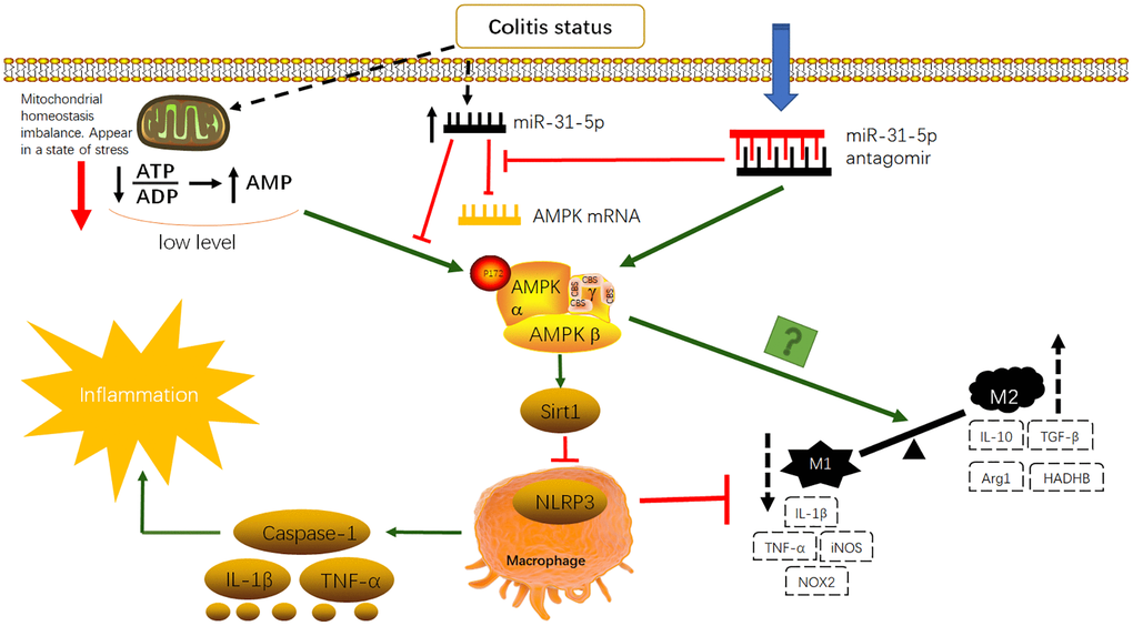 In summary, miR-31-5p antagomir ameliorated DSS-induced colitis in mice by transforming M1-type macrophages into M2-type macrophages, reducing inflammatory infiltration by macrophages and restoring intestinal epithelial barrier function. The AMPK/Sirt1/NLRP3 signaling pathway was likely to have been involved.