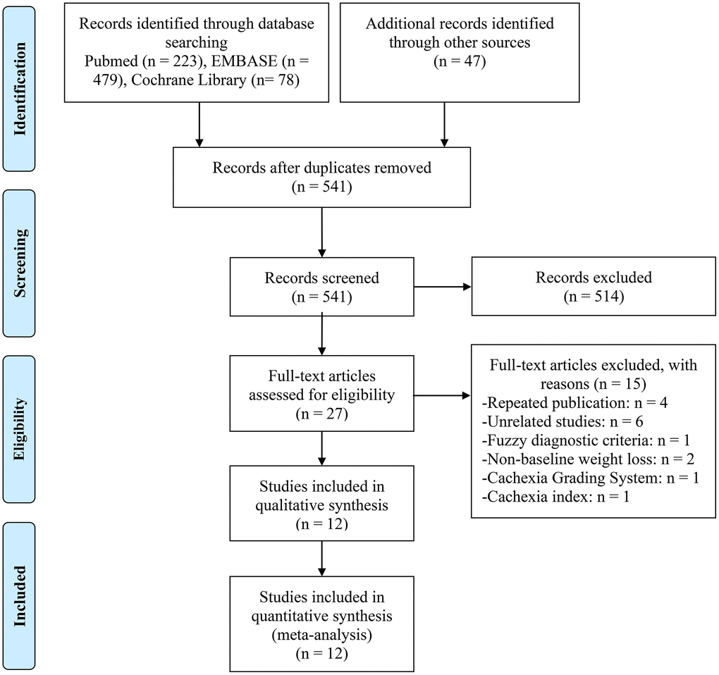 The following criteria were met by articles in English to be included in this study: (i) cancer patients who received ICIs; (ii) research evaluating the influence of cachexia before ICI therapy; (iii) outcomes such as overall survival (OS), progression-free survival (PFS), time to treatment failure (TTF), or objective response rate (ORR) were reported. ORR was defined as the percentage of individuals who achieved complete response or partial response as best response to treatment. Besides, the diagnosis of cachexia was based on the criteria established by Fearon et al. [12]. The following were the exclusion requirements: (i) study designs such as animal studies, case reports, and conference abstracts.
