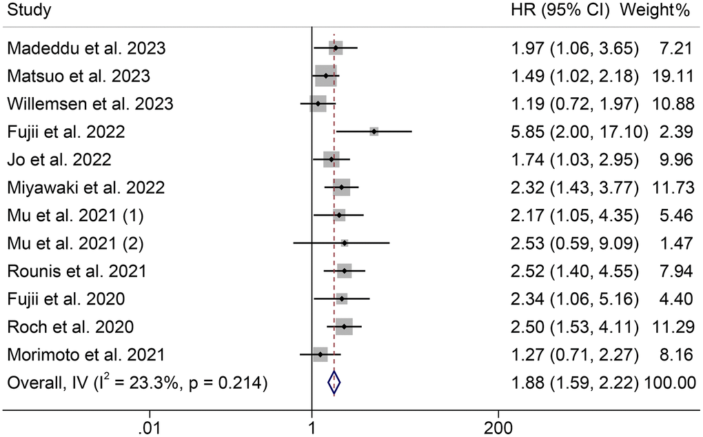 The effect of pre-treatment cachexia on OS in cancer patients treated with ICIs was examined in 12 cohorts, including 1333 participants. A fixed-effect model was used since the Cochran Q test and I2 statistics showed no significant heterogeneity (p = 0.214, I2 = 23.3%). The pooled results revealed that cancer patients with cachexia had significantly poorer OS than those without cachexia (HR = 1.88, 95% CI: 1.59–2.22, p < 0.001, Figure 2). NSCLC patients were recruited in 10 cohorts, and NSCLC patients with cachexia have shorter OS (I2 = 15.4%, p = 0.301; HR = 1.97, 95% CI: 1.64–2.36, p < 0.001, Supplementary Figure 1).