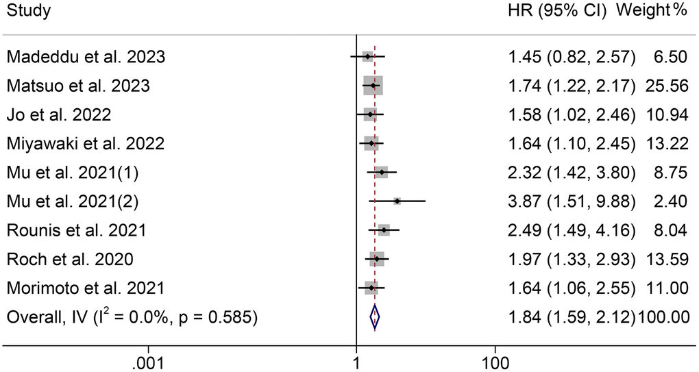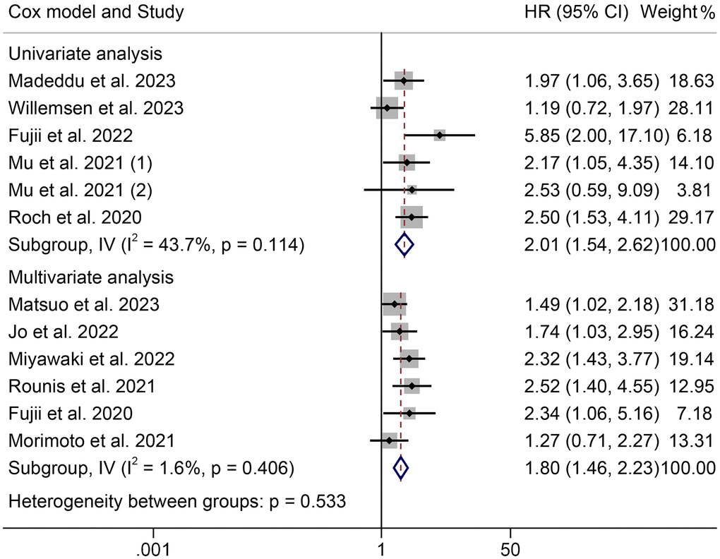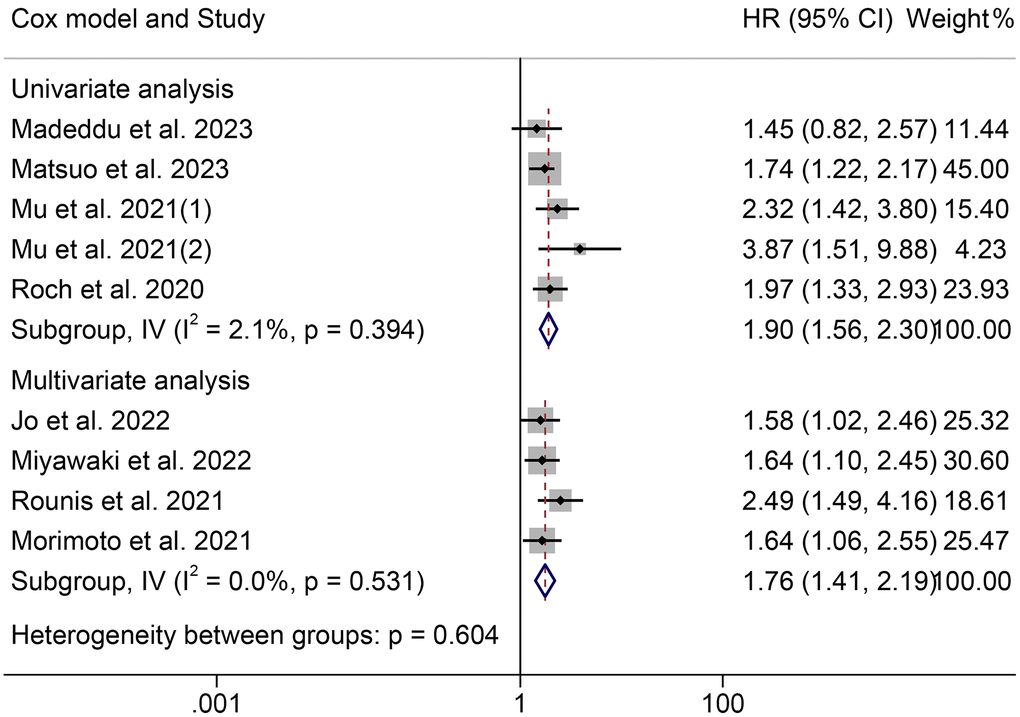 The HRs for OS according to the Cox proportional hazards model used are shown in Figure 3. Univariate and multivariate analyses were conducted in six cohorts, respectively. The HRs (95% CIs) were 2.01 (1.54–2.62) for univariate analyses and 1.80 (1.46–2.23) for multivariate analyses. There were no significant differences among the different models (P = 0.533).