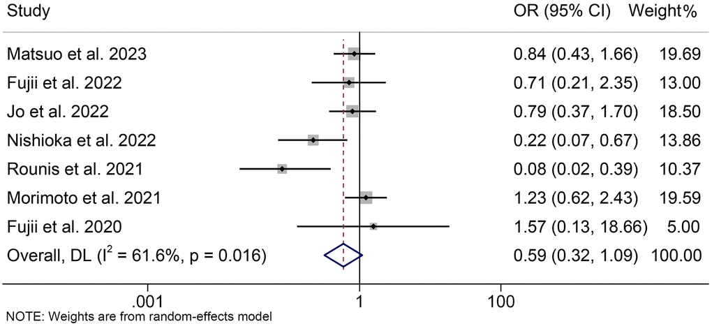 We also assessed the relationship between cachexia and the overall response rate. Due to significant heterogeneity, we used a random effects model (I2 = 61.6%, p = 0.016). The pooled analysis indicated that there was a trend towards a lower ORR in cancer patients with cachexia compared to those without cachexia, although not statistically significant (OR = 0.59, 95% CI: 0.32–1.09, p = 0.093, Figure 6). Besides, pooled analysis that included only NSCLC patients was consistent with the above findings (OR = 0.55, 95% CI: 0.29–1.06, p = 0.076, Supplementary Figure 3).