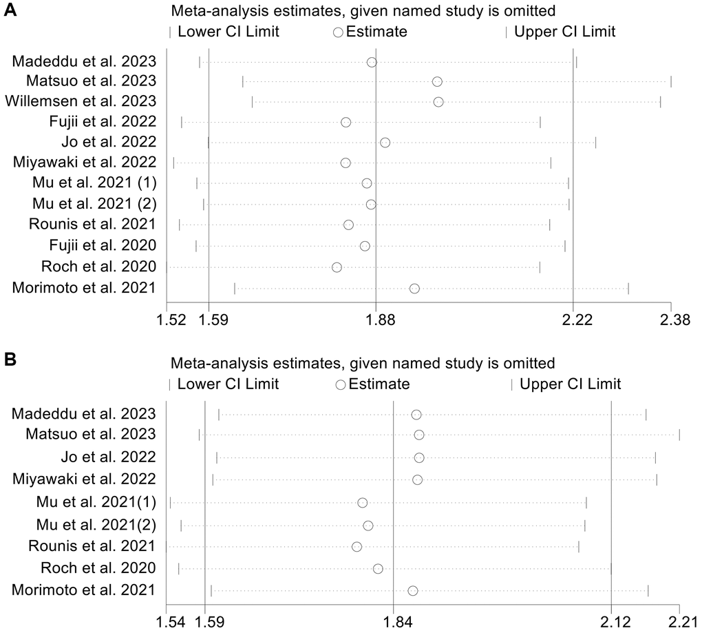 OS and PFS, the primary outcome indicators in this study, were subjected to sensitivity analyses and publication bias tests. The sensitivity analysis results are provided in Figure 7A, 7B. When any individual study was eliminated from the analysis, the pooled HRs for OS and PFS were similar. In addition, sensitivity analysis of ORR also confirmed that the above results are stable (Supplementary Figure 4). The funnel plot, Begg’s test (OS, p = 0.224; PFS, p = 0.602) and Egger’s test (OS, p = 0.077; PFS, p = 0.134) did not reveal any publication bias in OS (Supplementary Figure 5A) and PFS (Supplementary Figure 5B).