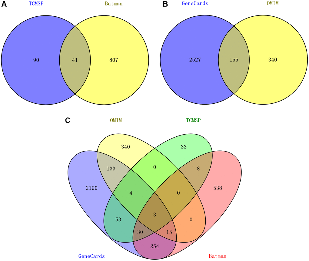 All ingredients of four main compounds (guizhi, fuzi, shudihuang, huangjing) in CFF-1 were acquired from TCM Systems Pharmacology Database and Analysis Platform (TCMSP, http://tcmspw.com/tcmsp.php) and a Bioinformation Analysis Tool for Molecular mechanism of Traditional Chinese Medicine (BATMAN-TCM, http://bionet.ncpsb.org/batman-tcm/). The criteria to screen for active ingredients were set as the oral bioavailability (OB) ≥30% with the drug similarity (DL) ≥0.1, and p < 0.05 with score >20, respectively.