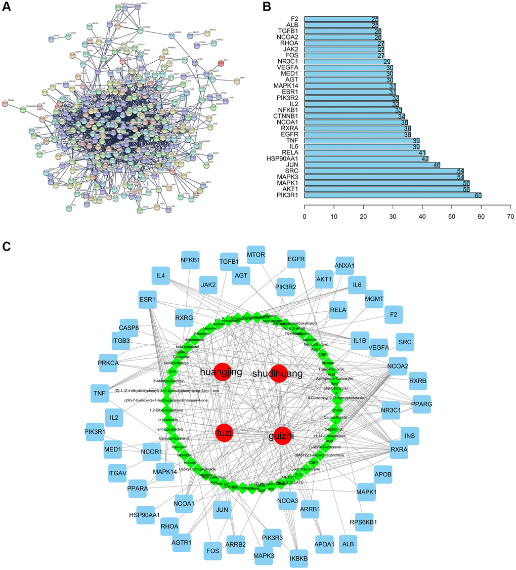 STRING database (https://string-db.org/) is used to construct the relationship between multiple proteins. We put the key targets of CFF-1 and PCa into the STRING database Version 11.0, selecting the Homo sapiens for the species to perform the PPI network with Cytoscape software Version 3.9.1. Targets with interaction score ≥0.9 and degree ≥20 were regarded as core targets. In order to study the relationship among CFF-1, the core targets and PCa, main herbs, active ingredients and core targets were imported into the Cytoscape software to construct the herbs-active ingredients-target network.