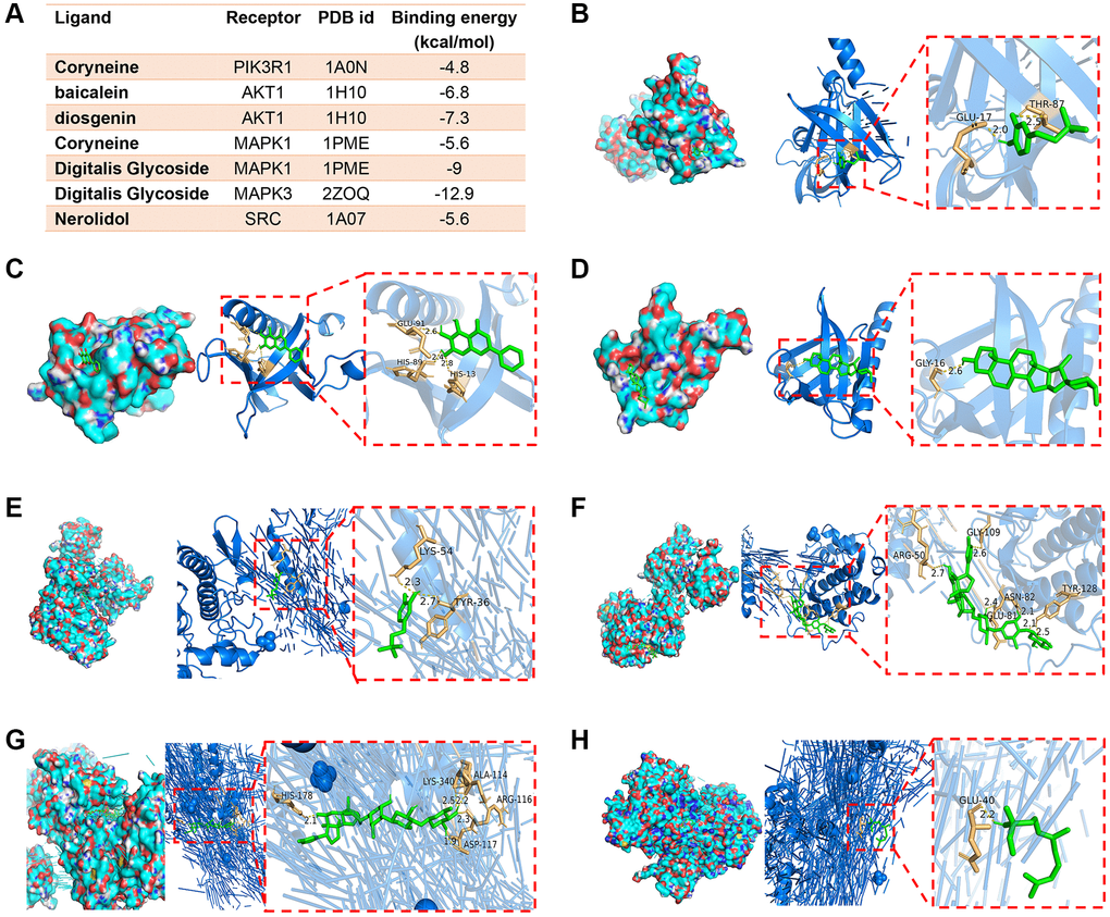 As previously mentioned, PIK3R1, AKT1, MAPK1, MAPK3 and SRC were the top five hub targets in PPI network. These targets were then docked with their respective active ingredients. The ligand-receptor binding energy values, indicative of binding stability, were presented in Figure 3A. Generally, a binding energy lower than −5 kcal/mol is considered indicative of stable binding. Notably, coryneine establishes two hydrogen bonds with GLU-17 and THR-18 in PIK3R1, while baicalein forms three hydrogen bonds with GLU-91, HIS-89 and HIS-13 in AKT1. Diosgenin forms one hydrogen bond with GLY-16 in AKT1. Coryneine and digitalis glycoside bound to MAPK1 with binding energy values of −5.6 kcal/mol and −9 kcal/mol, respectively. Among these, the binding affinity of digitalis glycoside to MAPK3 was the strongest, with a value of −12.9 kcal/mol. Additionally, nerolidol forms one hydrogen bond with GLU40 in SRC (Figure 3B–3H).