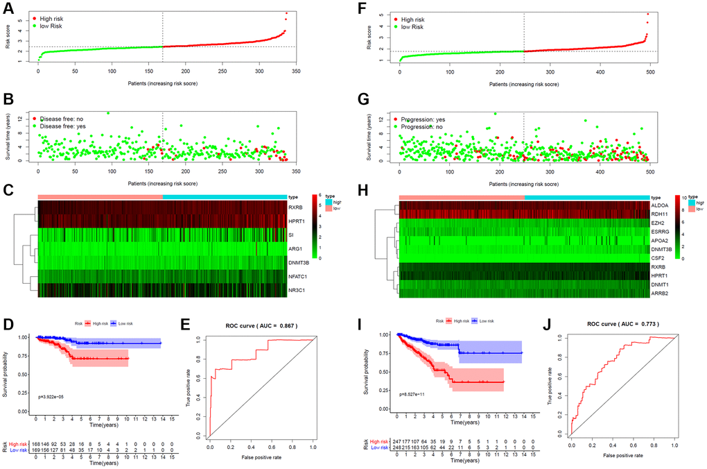 The risk score for predicting PFS was calculated as follows: Risk score =ALDOA × 0.0003 + DNMT3B × 0.222 + CSF2 × 0.099 + DNMT1 × 0.031 + EZH2 × 0.054 + ARRB2 × 0.019 − ESRRG × 0.025 + APOA2 × 0.007 + RXRB × 0.076 + HPRT1 × 0.021 − RDH11 × 0.0001. A 11-gene signature was constructed (Figure 5F). Progression patients were mainly distributed in the high-risk group (Figure 5G). The expression profile showed that ALDOA, DNMT3B, CSF2, DNMT1, EZH2, ARRB2, APOA2, RXRB and HPRT1 were highly expressed in the high-risk group, except for ESRRG and RDH11 (Figure 5H). Kaplan–Meier curves showed that PFS was significantly worse in high-risk patients than low-risk patients. AUC of ROC curve for the PFS prediction was 0.773 (Figure 5I, 5J).