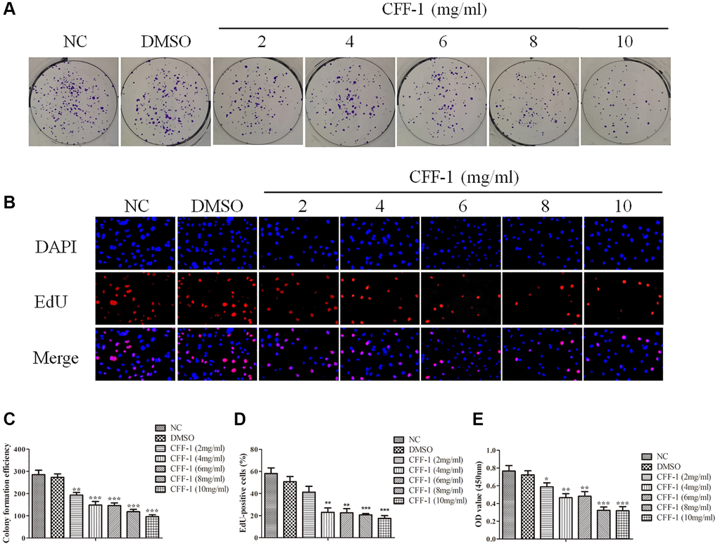 PC-3 cells were transplanted into 6-well plates with a density of 2 × 103 cells/well and then the cells were treated with or without CFF-1 incubated for 10 days at 37°C. Cells were fixed in 4% paraformaldehyde and stained with crystal violet. The numbers of visible colonies were counted under an optical microscope.