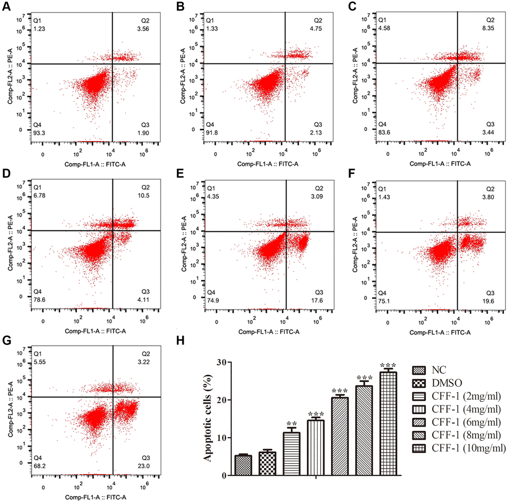 PC-3 cells were treated with various concentrations of CFF-1. After 24 h, apoptosis was detected by the annexin V-FITC apoptosis detection kit (cat. #640932, Biolegend, USA) adhering to the manufacturer’s protocol.
