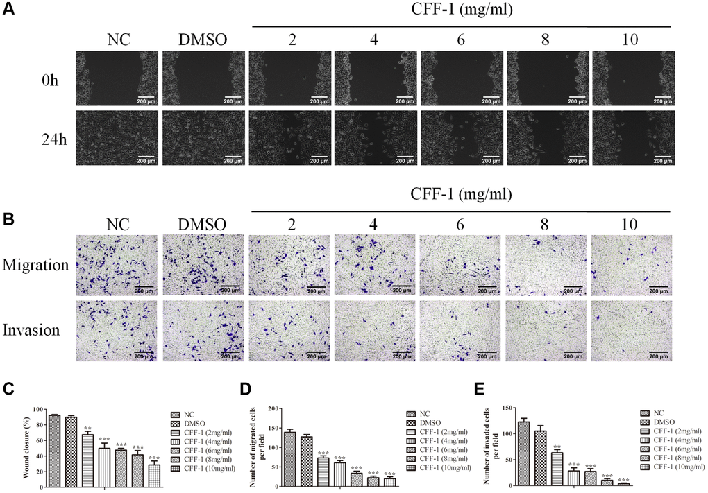 PC-3 cells were added into 6-well plates and incubated until 100% confluence. After scraping in a straight line using a 200 μl pipette tip, the cells were rinsed thrice with PBS. Varying concentration of CFF-1 was administered to each well. The cell migration data were acquired with an inverted microscope Olympus IX51 at 0 and 24 h incubation and assessed using Image-Pro Plus 7.0 software.