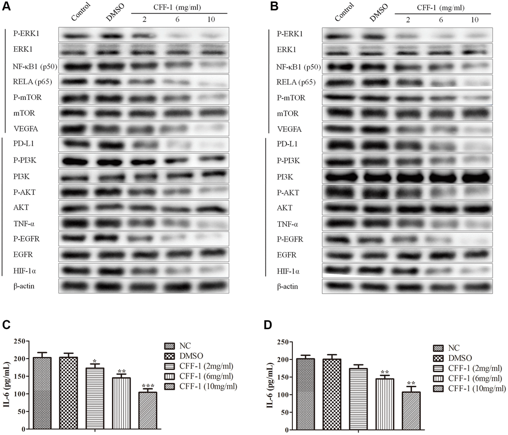 According to network pharmacology analysis, the PI3K-Akt, HIF-1, TNF, EGFR-TKI resistance and PD-1 checkpoint pathway might play a crucial role in regulating PCa cell proliferation and survival by CFF-1. Then, we evaluated the expressions level of the common key targets of the five pathways. Pretreatment of CWR22Rv1 and PC3 cells with CFF-1 (2, 6 and 10 mg/ml) resulted in apparent repression of P-ERK1, NFκB1, RELA, P-mTOR, VEGFA, PD-L1, P-PI3K, P-AKT, TNF-α, P-EGFR and HIF-1α in dose dependently (Figure 9A, 9B). ELISA assays indicated that the secretory IL-6 of CWR22Rv1 and PC3 cells was blocked by CFF-1 dose dependently (Figure 9C, 9D). These findings suggested that the above five pathways might be crucial for CFF-1 anti-cancer effect in PCa.