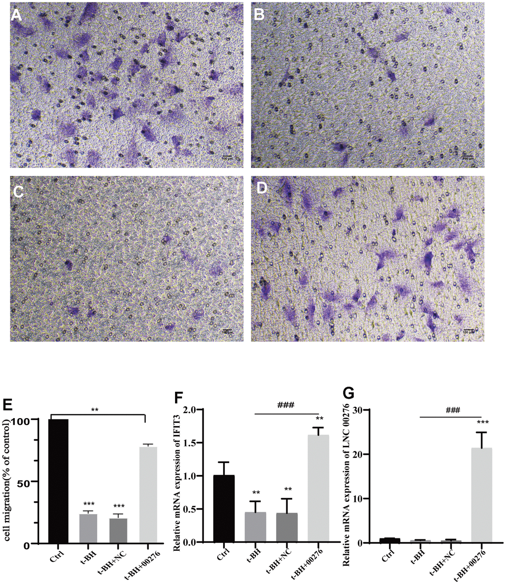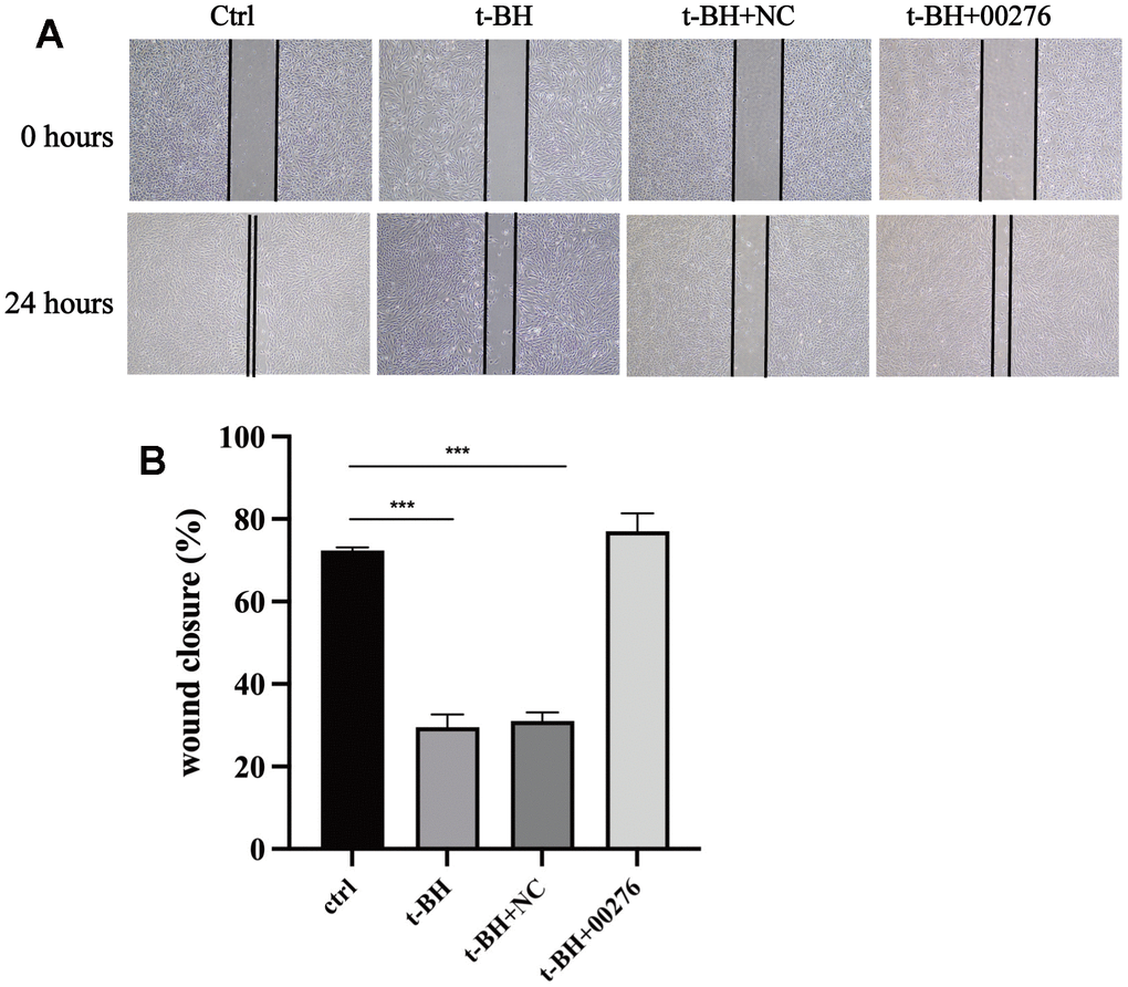 In the cell scratch test, the wound healing ability of APRE-19 cells after t-BH treatment was attenuated compared with the blank group (Figure 10A), and the wound healing ability of the cells was significantly improved after LINC00276 overexpression (Figure 10B).