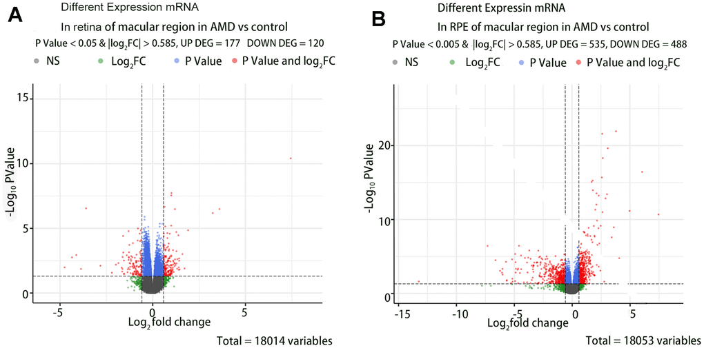 A total of 407 DE-mRNAs and 429 differentially expressed lncRNAs were identified when comparing the retina and RPE in the macular region of AMD patients to those of controls (P < 0.05 and |log2FC| > 0.585). We visualized the differential gene analysis results with a volcano map plot. Figure 2 shows the volcano map of the DE-mRNAs in group (1) and group (2).