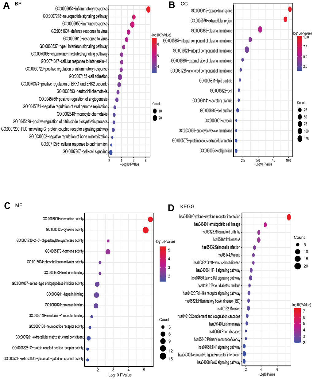 Using Database for Annotation, Visualization, and Integrated Discovery (DAVID), GO and KEGG analyses were performed on these genes to investigate their activities and signaling networks. The top 20 GO and KEGG pathway enrichment terms were identified, as shown in Figure 3. The GO functions that were the most enriched were the inflammatory response (GO: 0006954), neuropeptide signaling pathway (GO: 0007218) and immune response (GO: 0006955), which involved 29, 13 and 26 differentially expressed genes (DEGs), respectively.