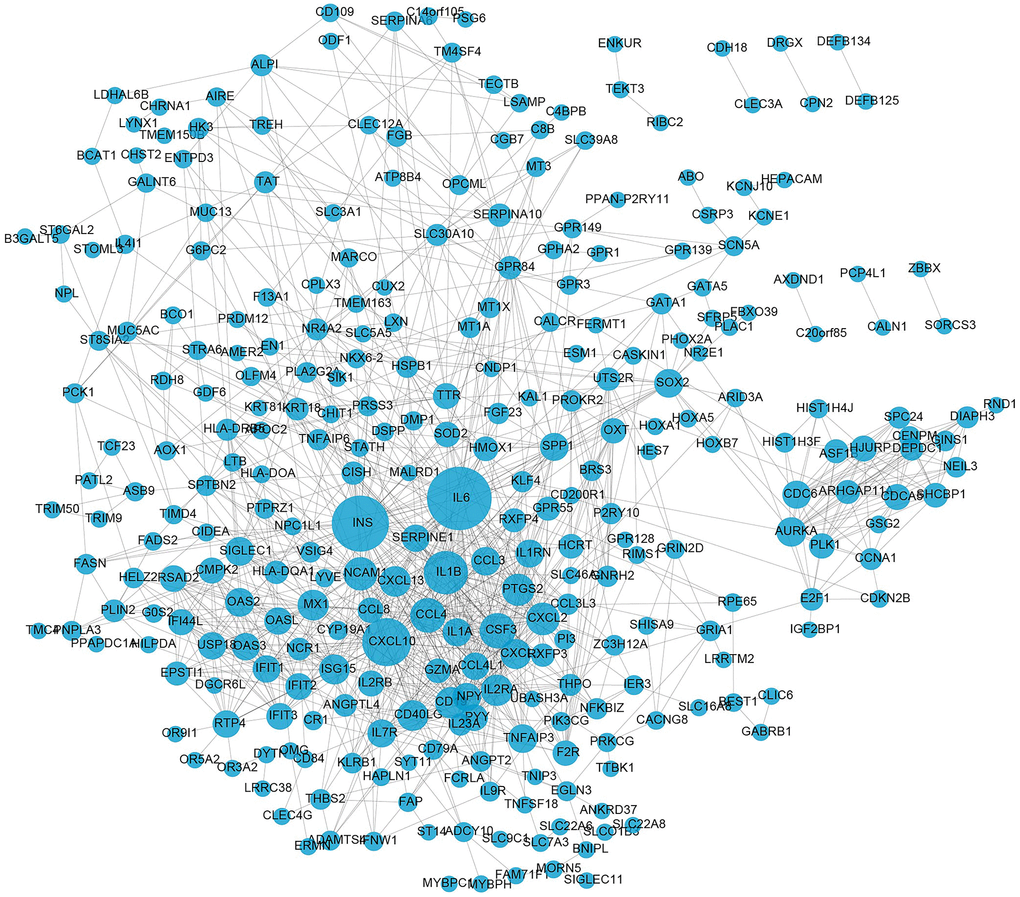 From the visualized results obtained by Cytoscape, as shown in Figure 4, we could see that in the PPI network, there were 296 nodes and 1072 edges. The genes in the figure that have more protein interactions with other nodes were mostly immune-related genes (such as IL6, IL1A, IL1B, ING, CXCL10, etc.), indicating that immune cells are crucial for the emergence of AMD. These results were consistent with the GO enrichment and KEGG pathway analysis results.