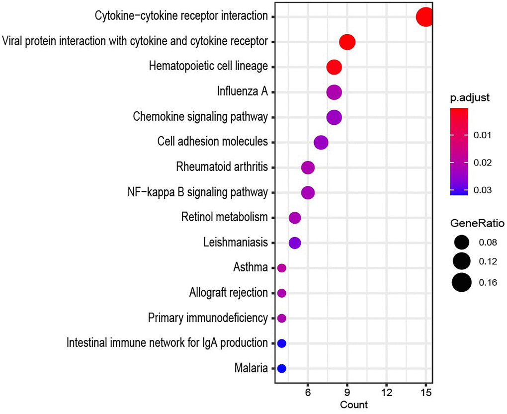 The top Kyoto Encyclopedia of Genes and Genomes (KEGG) signaling pathway was associated with cytokine-cytokine receptor interaction and involved 23 DEGs, as shown in the bubble chart in Figure 3.