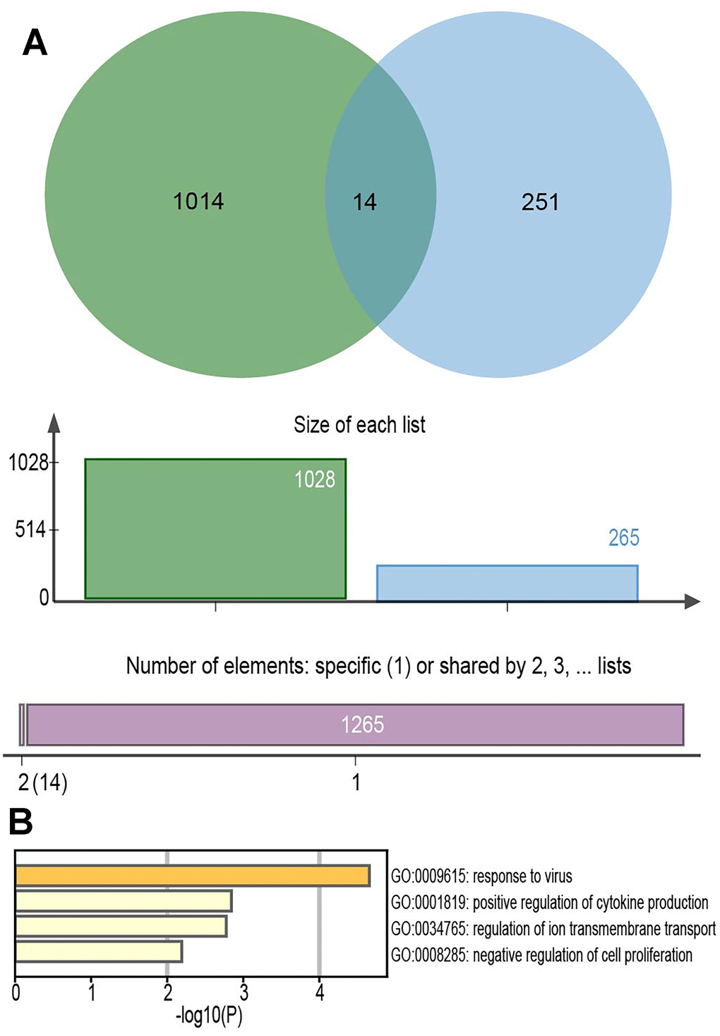 From the intersection of the mRNAs co-expressed in GSE135092 and the differentially expressed mRNAs obtained from GSE115828, a total of 14 key DE- mRNAs were obtained (Figure 6A). They were PODN, F2R, SLC38A11, HSPB1, CLIC6, CISH, GDPD2, RSAD2, IFIT3, PCDHA4, IGSF1, KCNH5, IFI44L, and GDF6. They were most likely implicated in the action of the viral response and the positive regulation of cytokine production, according to functional analyses (Figure 6B).